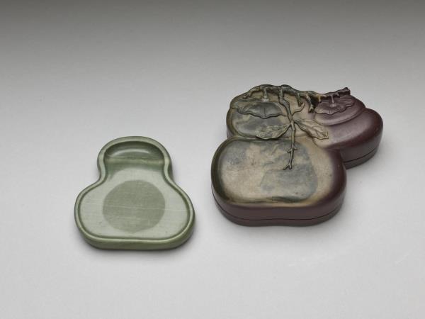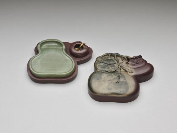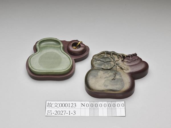 | 說明 | 綠色柿式硯,周緣起棱,下緣稍為內凹。石質潤澤,通體有深淺不同天然綠色橫紋,數道橫紋已近於白色。硯面有一較粗的橫橢圓形墨堂,餘皆打磨光滑,墨堂稍凹入。硯背周緣起棱,中央凹下處正中部位陰刻一行四字篆款:「乾隆年製」。紫色柿形硯盒,旁附一水盛,內置一金匙。盒用紫綠二層色石琢製而成,盒呈紫色,蓋面左方大柿子滿佈灰綠與碧綠色天然斑紋,前者尚延至右方小柿子之左下角。蓋面上緣高浮雕葉與藤,一細枝下垂,上附二葉,一正一覆,正者陰刻葉脈,覆者浮雕脈紋;柿子頂端皆浮雕蒂。 |
