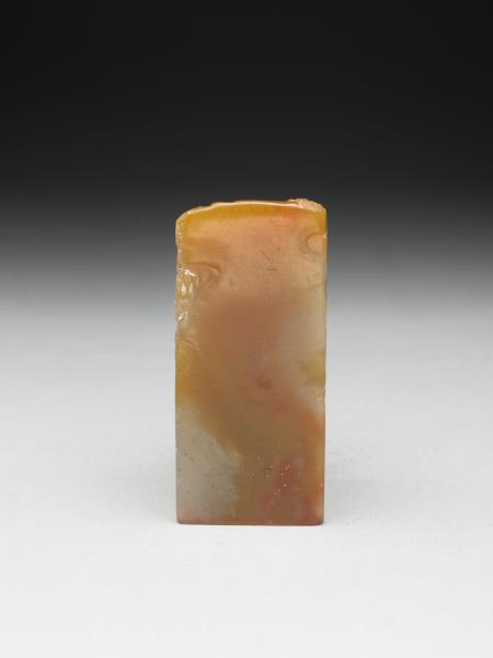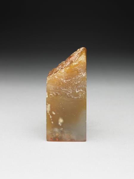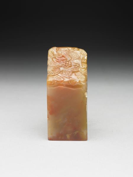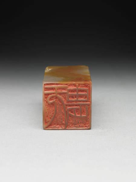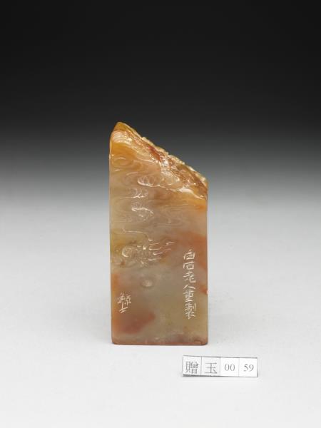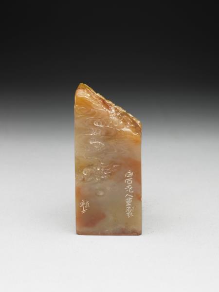 | 說明 | 壽山石章,黃色間雜紅色斑點,略可透光。長方體印頂作斜面,印面正方。印面陽刻二字篆文:「无畏」,此印為譚延闓的字號印,字型重心放在上方,下面佈白,疏密有緻,邊欄細如印文。邊款:「白石老人重製」、「鯨士」,即知此印是由齊白石重刻,原本鯨士刻製。印身上部薄意雲龍紋,自印頂延伸至印身。 |