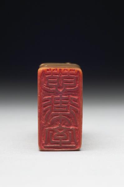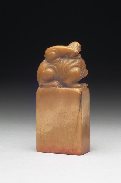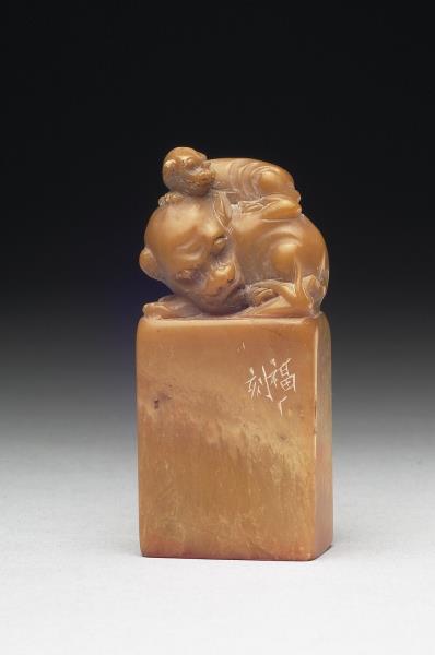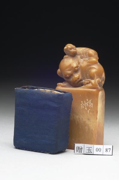 田黃石章,栗黃色。長方體,印面長方。印面陽刻三字篆文:「慈衛室」。邊款:「福厂刻」,福厂為印人王禔的號。鈕立雕兩獅,一大一小。附布套。