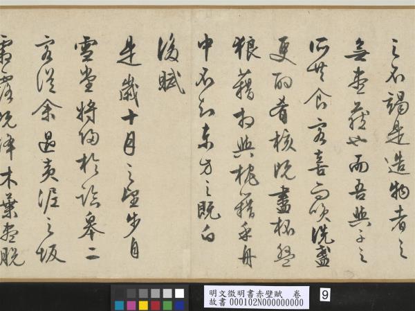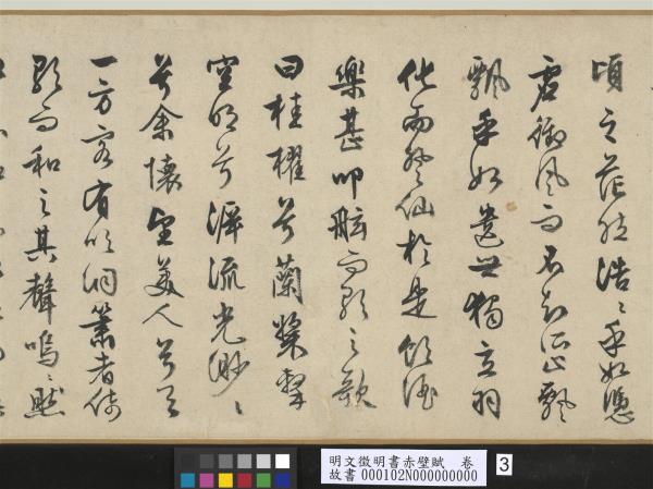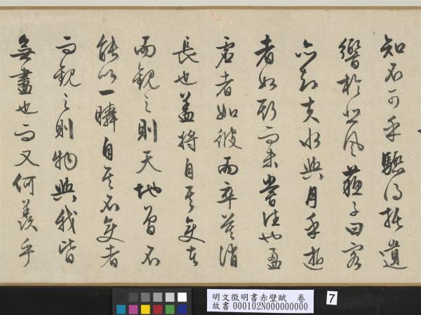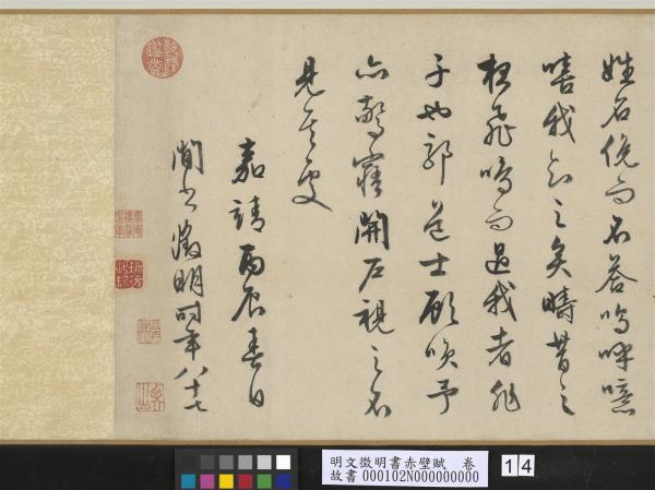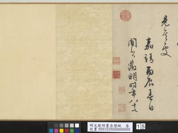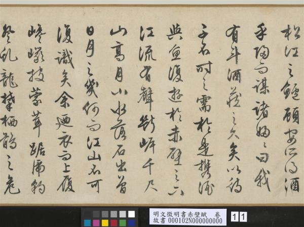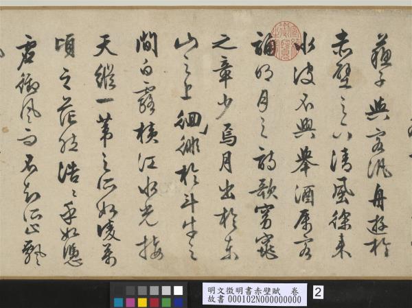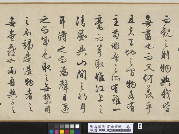 參考書目 劉宇珍,〈明文徵明書赤壁賦 卷〉,收入劉芳如主編《華夏藝術中的自然觀-唐獎故宮文物選萃特展》(臺北:國立故宮博物院,2016.09),頁206-209。