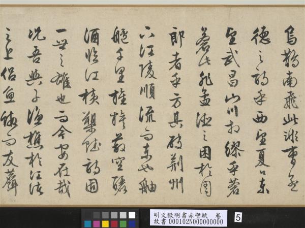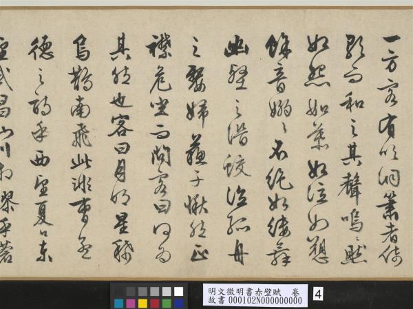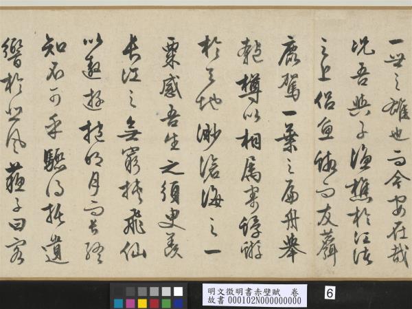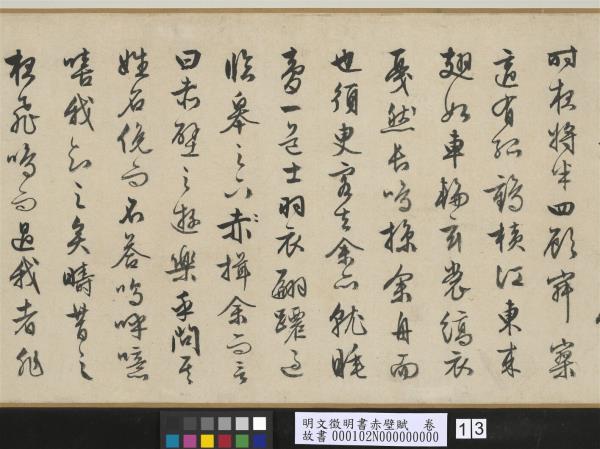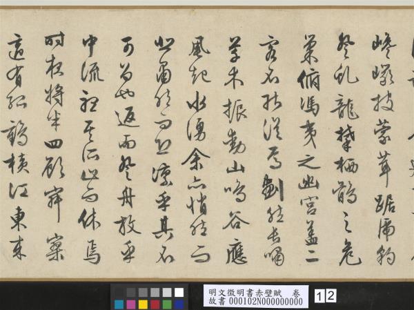 參考書目 1.〈明文徵明書赤壁賦〉,收入國立故宮博物院編輯委員會編,《赤壁賦書畫特展》(臺北:國立故宮博物院,1984年初版),頁15。 2.江兆申,〈文徵明書赤壁賦 卷〉,收入國立故宮博物院編,《吳派畫九十年展》(臺北:國立故宮博物院,1975年初版,1976年再版,1981年三版),頁317。