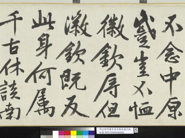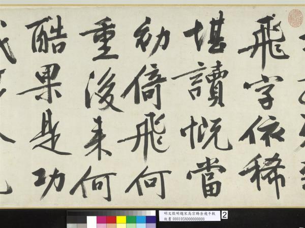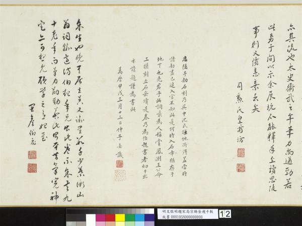 A colophon for this work says a Mr. Shen of Wuzhong dug up a stone engraving of an imperial order by the Southern Song emperor Gaozong. Wen Zhengming then wrote an inscription, putting more blame on Gaozong than Prime Minister Qin Kui for the demise of the Song, making for a unique historical opinion. In this work of large characters in running script, the brush force is strong yet free and untrammeled. Though written only a few days before Wen passed away at the Chinese age of 90 by, it is not slacking in the least.(20110101)