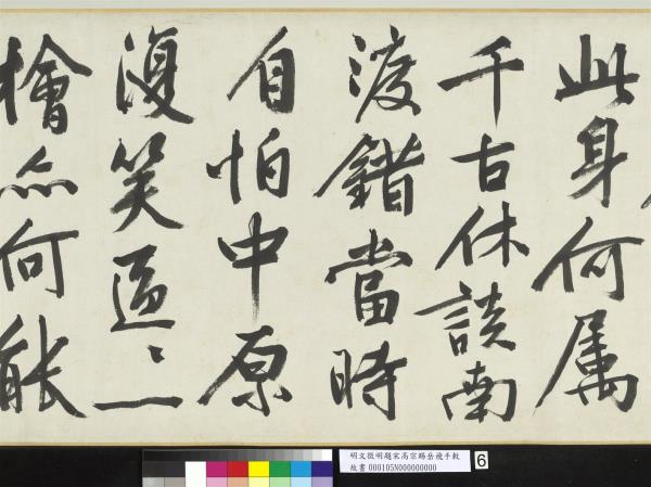 文徵明(1470-1559)、江蘇長洲の人。本名は壁、字は徵明、後に字をもって名の代わりとした。別名は停雲生、衡山居士。詩文、書畫それぞれに優れ、明四大家の一人に列せられた。その書は初め宋、元代の書法を学んだが、後に晉、唐代の書を手本とし、各書体に精通していた。卷末の跋文によれば、吳中沈が高宗の自書の石刻を発見したことを知り、そのために題詞を書いたという。「(秦檜は奸臣として蔑まれているが、)全ては高宗に帰すのであって、秦檜の罪はそれほど重くない。」正に古今に通じる独自の見解だと言えるだろう。全体に大字の行書で書かれており、力強い筆遣い、伸びやかな結字、90歳でこの世を去る數日前に書いたものだが、いささかも散漫なところがない。(20110101)