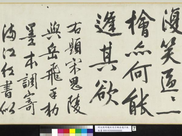1.江兆申,〈文徵明題宋高宗賜岳飛手敕詞 卷〉,收入國立故宮博物院編,《吳派畫九十年展》(臺北:國立故宮博物院,1975年初版,1976年再版,1981年三版),頁319。