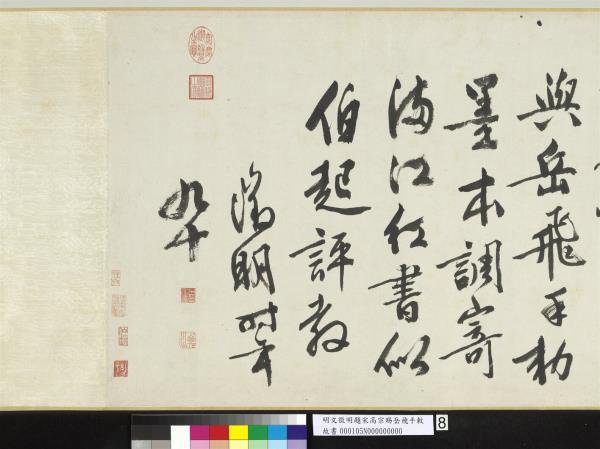 吳誦芬、童文娥、譚怡令,〈明文徵明題宋高宗賜岳飛手勅詞 卷〉,收入《明四大家特展-文徵明》(臺北:國立故宮博物院,2014.03),頁218-221、339-340。