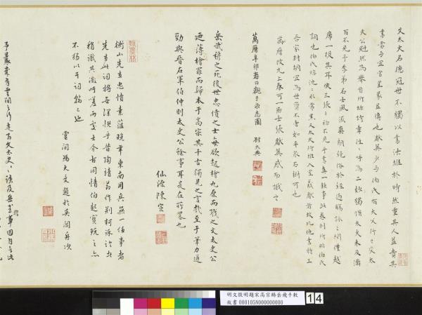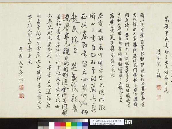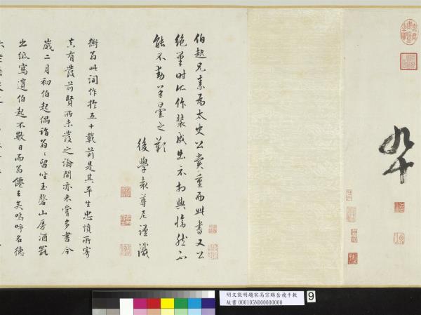 屈賈之辭為可傳者。皆忠憤所激。衡山之書佳已。而其詞嚴。其義正。此卷即常留天地間可也。伯起氏珍之。楚武陵龍膺。