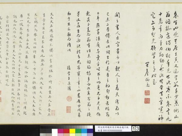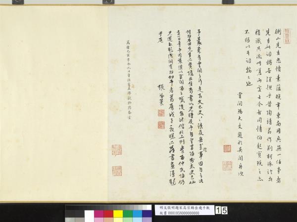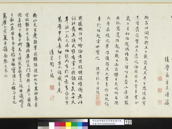 聞之昔人云。字畫可以觀人之壽夭。衡翁以己未二月僊去。此詞書於是月之初旬。相去殆數日耳。點畫法度無異平時。公之所養。不可見矣。伯起昆玉。素為翁重。往來詞翰特多。而此卷則翁之絕筆。又若書為永訣然者。尤當寶之重之也。萬曆甲戌春幼于出示。敬為識此。後學王延陵。 |
