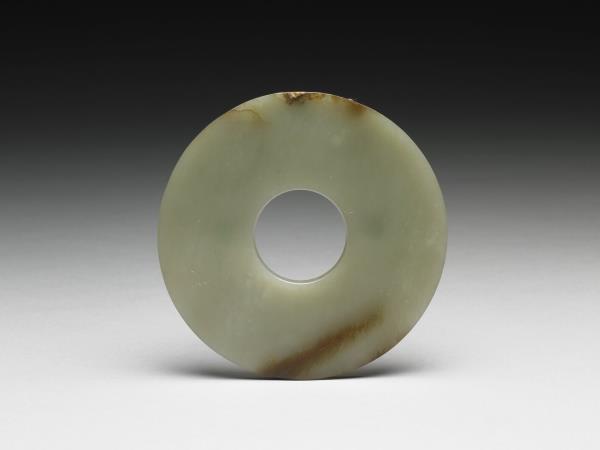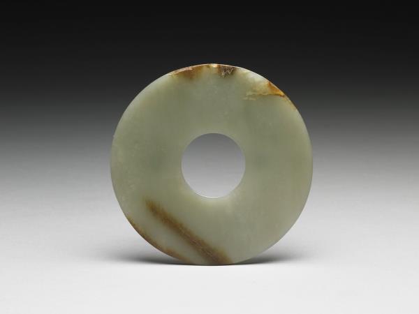 青白玉璧,溫潤的白色中透出淺綠色,邊緣有赭斑,面上有一道小裂痕,並伴隨著受沁而成的赭色痕,全器光素無紋,應是後代仿古作品。