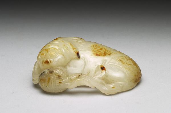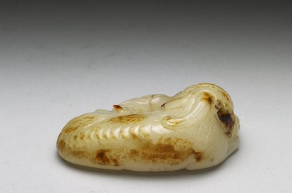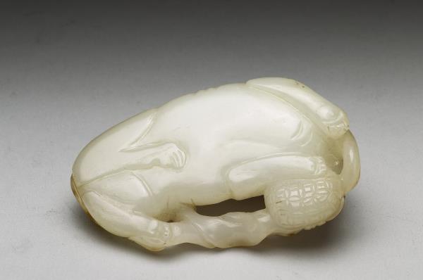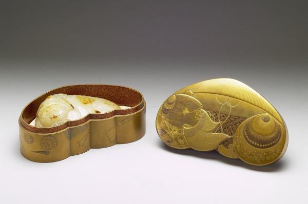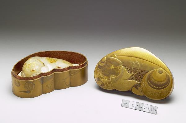 玉獅,玉色白,有赭斑。獅作趴伏姿,前肢環抱圓毬,獅目垂閉,枕於毬上,似正安眠,而獅身柔和的弧線,似乎也增添了寧靜的氣氛,只有圓毬上的帶子飄動著,更映襯出整體的安靜氣息。本器置於〈清 貝形蒔繪盒〉中。