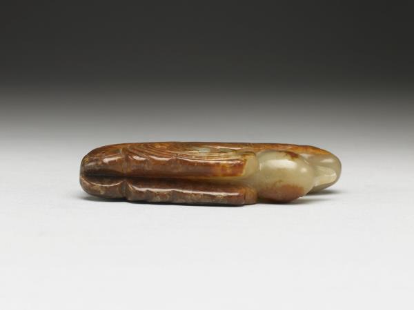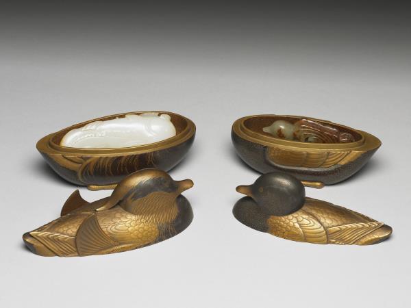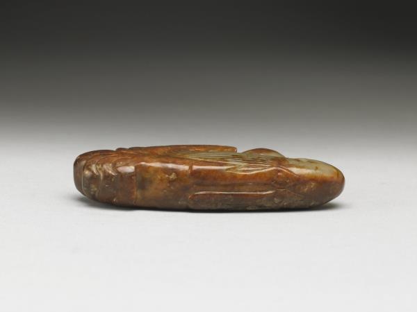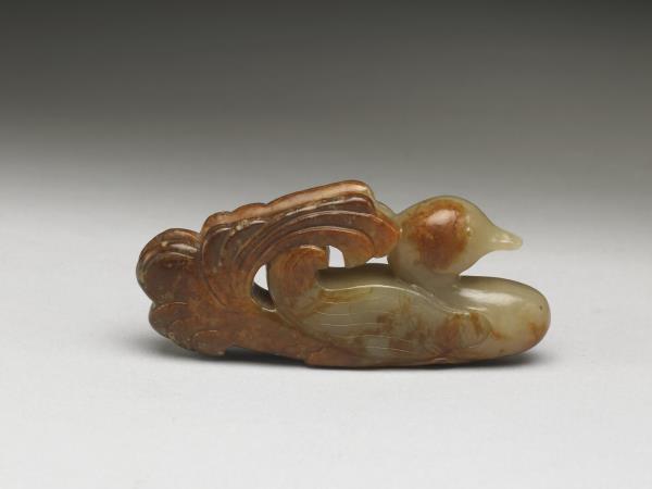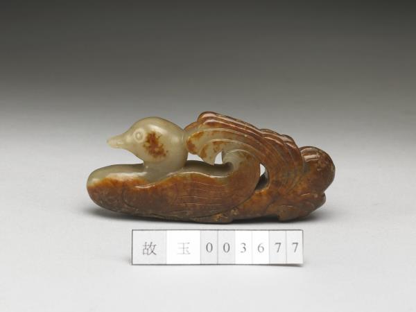 青黃玉料,含有大量三氧化二鐵,致使大面積呈現紅糖色。一般俗稱「糖玉」。此一造形明顯是遷就原有玉料作厚片形,琢成一蹲伏的鳳鳥,長尾捲翹至鳳首後方。本器置於〈清鴛鴦形蒔繪 盒〉中。