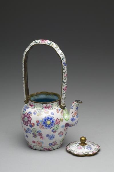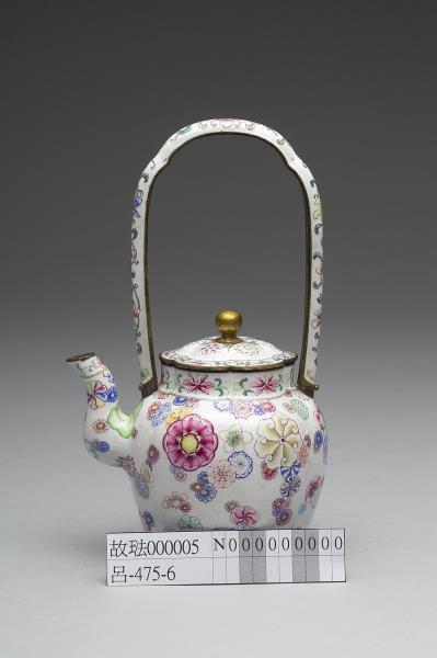 銅胎畫琺瑯。器腹、蓋與底作六瓣式,直頸,碩腹,平底,彎流,帶球鈕蓋,並裝高提梁。器表以白釉為地,提梁、口緣與圈足側圍纏枝番蓮一道,腹繪飾各式皮球式團花,用彩多樣,展現活潑熱鬧的裝飾風格。器底白地藍書「乾隆年製」,加雙圓框,本件一式成對(與故琺4),共儲於有題款「乾隆年製銅胎洋琺瑯六瓣提梁壺一對」木匣中。