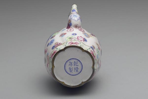 | 說明 | 銅胎畫琺瑯。器腹、蓋與底作六瓣式,直頸,碩腹,平底,彎流,帶球鈕蓋,並裝高提梁。器表以白釉為地,提梁、口緣與圈足側圍纏枝番蓮一道,腹繪飾各式皮球式團花,用彩多樣,展現活潑熱鬧的裝飾風格。器底白地藍書「乾隆年製」,加雙圓框,本件一式成對(與故琺4),共儲於有題款「乾隆年製銅胎洋琺瑯六瓣提梁壺一對」木匣中。 |