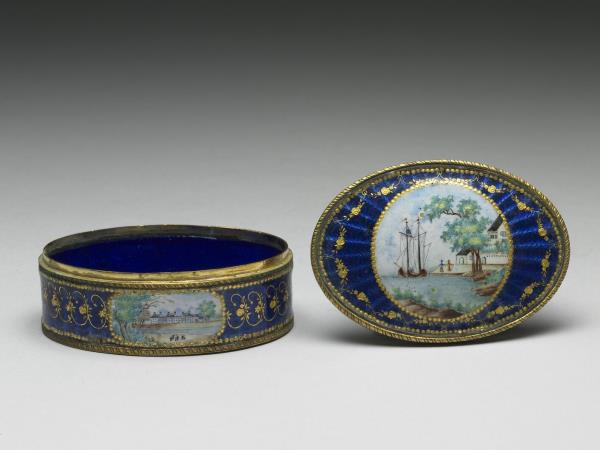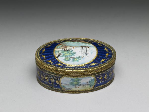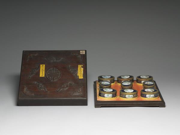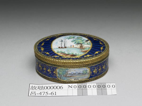銅胎蓋盒,盒身邊緣有雕銅花邊,蓋與器壁皆開光彩繪西洋風景畫,其餘以藍色透明琺瑯並以金箔刻花琺瑯裝飾,底為藍色琺瑯。一組共九件(故琺6-14),合儲於雕福壽木盒中,內有糊橘色綾與錦座。罕見成組盒裝西洋琺瑯盒,或為廣州生產,應為進貢之用。