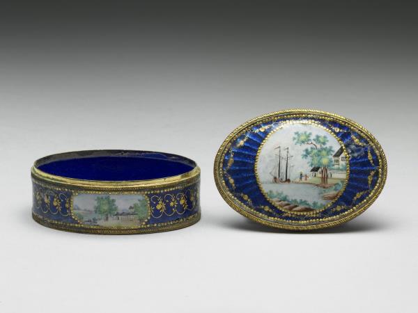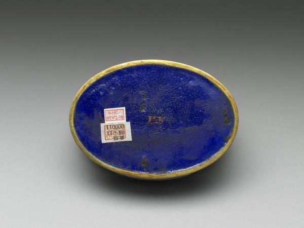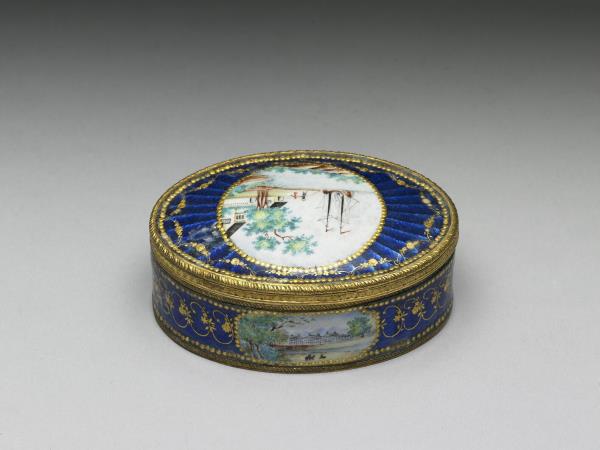 銅胎蓋盒,盒身邊緣有雕銅花邊,蓋與器壁皆開光彩繪西洋風景畫,其餘以藍色透明琺瑯並以金箔刻花琺瑯裝飾,底為藍色琺瑯。一組共九件(故琺6-14),合儲於雕福壽木盒中,內有糊橘色綾與錦座。罕見成組盒裝西洋琺瑯盒,或為廣州生產,應為進貢之用。