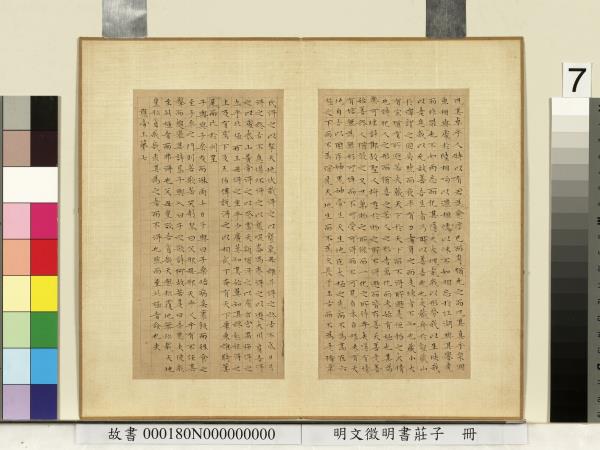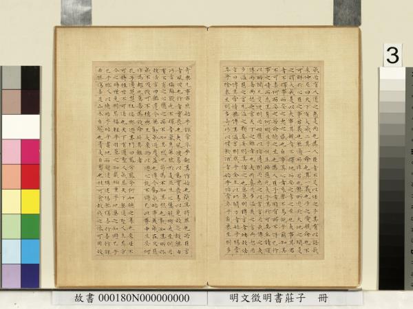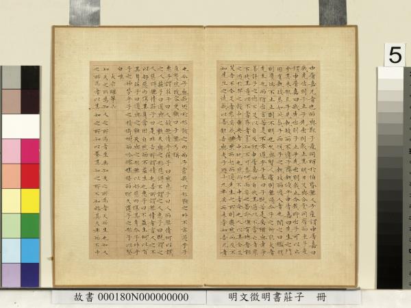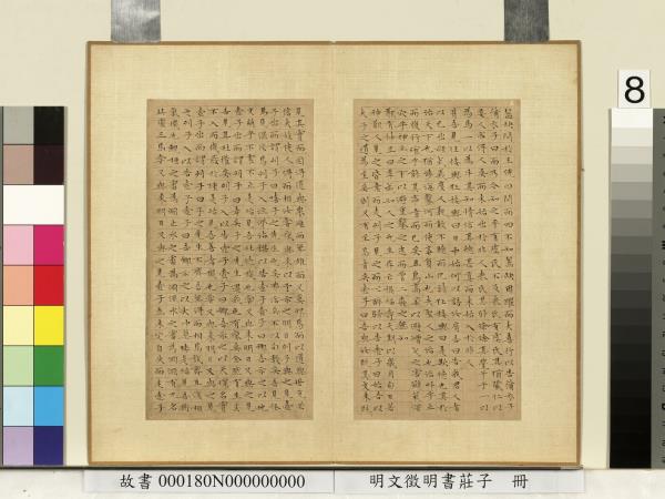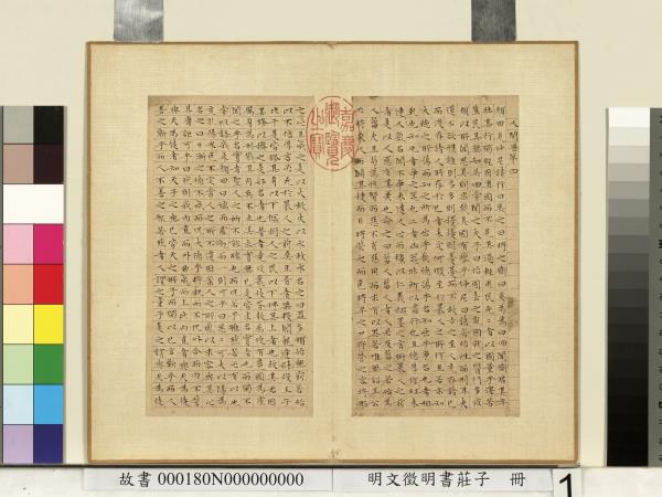 文徵明(西元一四七0-一五五九年),初名壁,字徵明,後以字行,號衡山居士,江蘇蘇州人。詩文書畫俱佳,為明代四大畫家之一。本幅墨筆烏絲闌,蠅頭小楷書《莊子》第四至第七篇,計十七幅,幾五千餘字,而從起始至終篇則無一懈筆。老練精到的筆法,展現出文氏溫純典雅的特有風神。署年嘉靖壬辰(一五三二),時作者六十三歲。