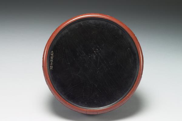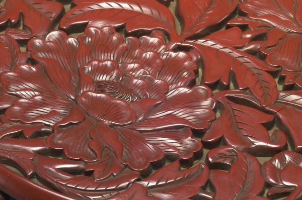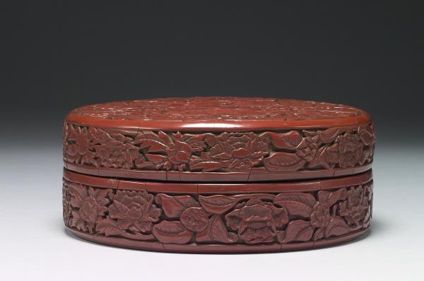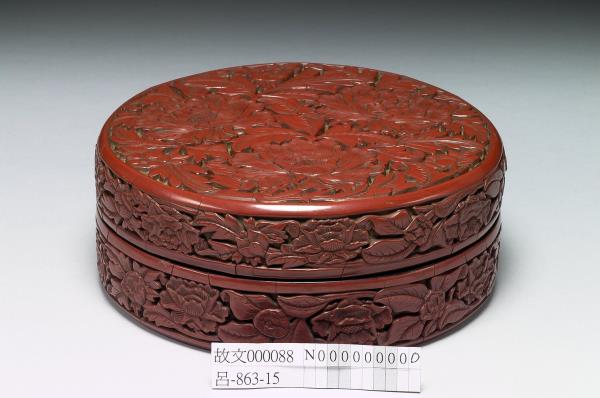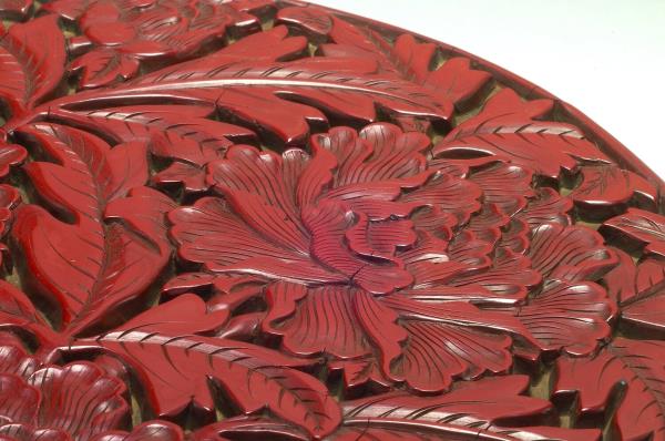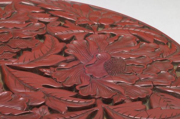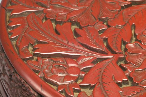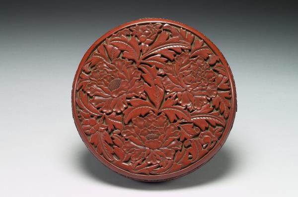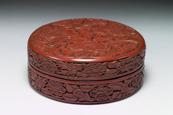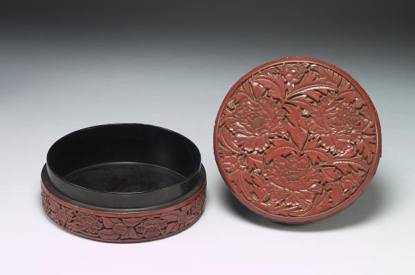 Carved-red lacquer round box with peony pattern |