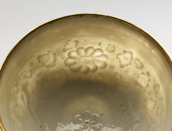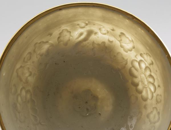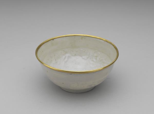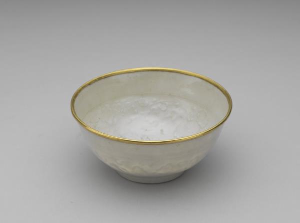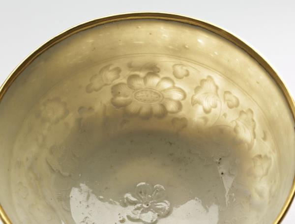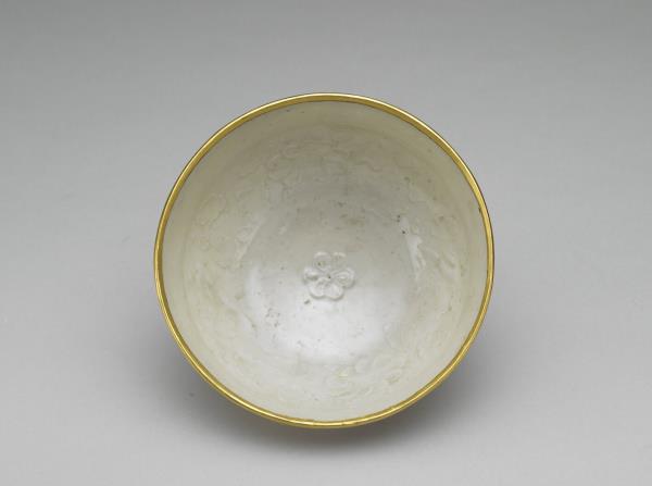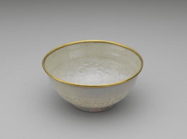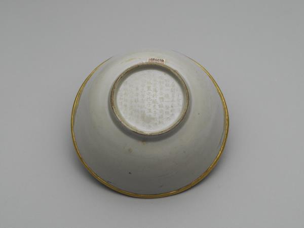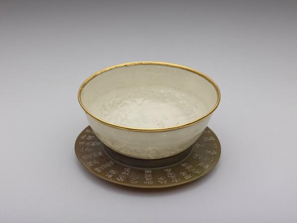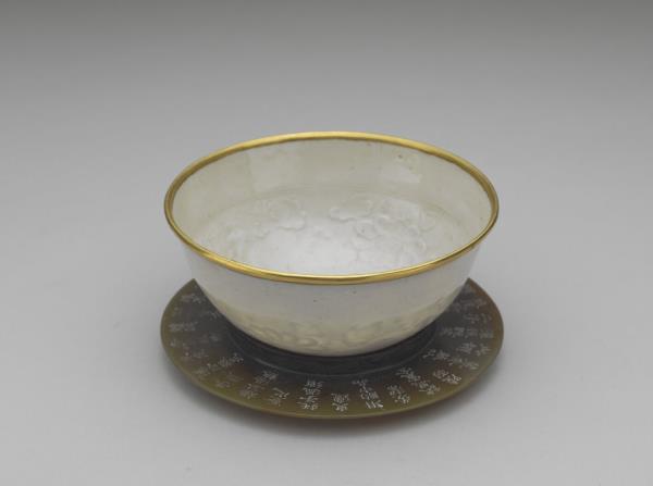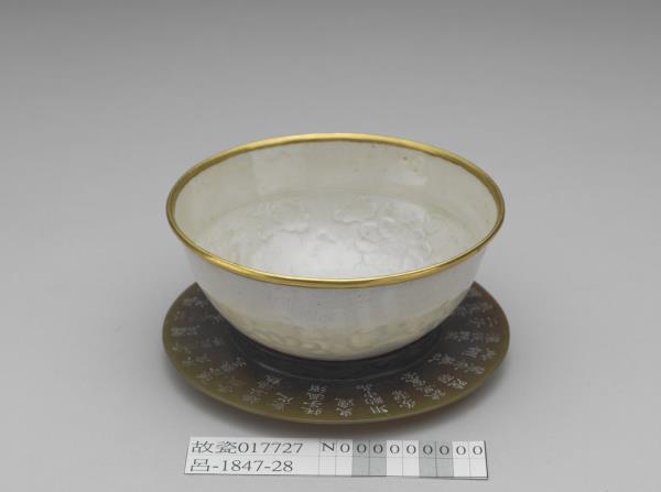 | 說明 | 敞口小碗,深弧壁下斂,圈足。器內外施透明釉,呈色白,外壁光素無紋,內壁以印花技法飾紋樣:內底心中央有六瓣盛開花一朵,內周壁飾盛開菊花與花葉。器壁甚薄,映光可見。口緣嵌金釦稜。此器附一新石器時代凸緣璧,並刻有乾隆御製詩,是清高宗以玉壁作為此瓷盞之盞托,而盞足恰可容於璧內緣,轉成瓷碗與茶托的組合。詩文為:「托子古玉滄桑閱,茗盂永樂傳胎脫。一脆一堅殊不倫,相資合體誠奇絶。輕於宋定薄於紙,炙手微嫌茶湯熱。置之托子温須臾,適用酌中品芳潔。試想盧仝陸羽輩,安能以此領茶悅。既笑二子或逢斯,掉頭弗顧應罷啜。」成於乾隆五十年(1785),收於《御製五集》卷十三。詩題為「詠玉托子 永樂脫胎茗盂」,則乾隆皇帝視此為永樂脫胎器,亦與永樂器不類。 |