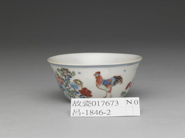 雞缸盃侈口,深壁下斂,近底處略外弧,平底內凹成足。全器以釉下青花及釉上彩釉繪飾紋樣。器外壁繪飾等距的兩組湖石花卉,將空間分為大約相同大小的兩個區段,其一繪公雞卓然而立,另一區段則見母雞帶著小雞覓食。雖然其底外有釉下鈷藍雙方框「大明成化年製」雙行六字楷款,暗示著本器是成化年間甚為著名的陶瓷品類:「鬥彩雞缸盃」,但若相較於院藏較可信賴的成化鬥彩雞缸盃(如故瓷5194、故瓷5195、故瓷5196),就會發現本器明顯為筆繪鬆散的仿作,為明末清初的作品。本器兩件一組,同置於木座之上。