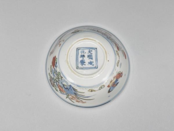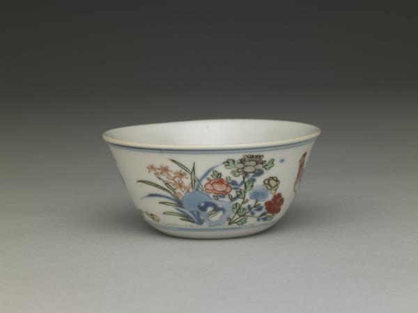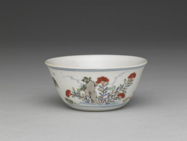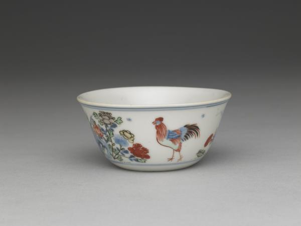 | 說明 | 雞缸盃侈口,深壁下斂,近底處略外弧,平底內凹成足。全器以釉下青花及釉上彩釉繪飾紋樣。器外壁繪飾等距的兩組湖石花卉,將空間分為大約相同大小的兩個區段,其一繪公雞卓然而立,另一區段則見母雞帶著小雞覓食。雖然其底外有釉下鈷藍雙方框「大明成化年製」雙行六字楷款,暗示著本器是成化年間甚為著名的陶瓷品類:「鬥彩雞缸盃」,但若相較於院藏較可信賴的成化鬥彩雞缸盃(如故瓷5194、故瓷5195、故瓷5196),就會發現本器明顯為筆繪鬆散的仿作,為明末清初的作品。本器兩件一組,同置於木座之上。 |