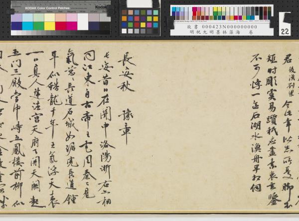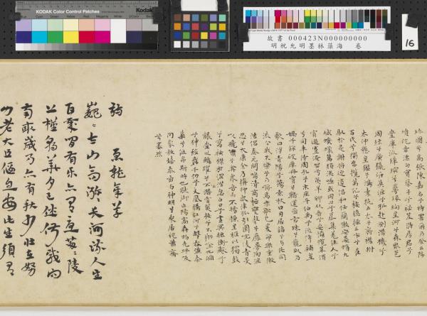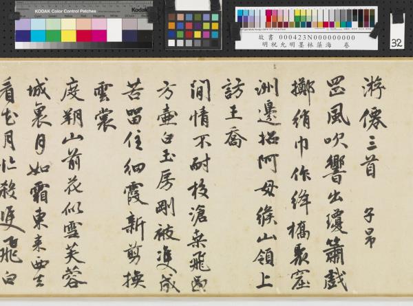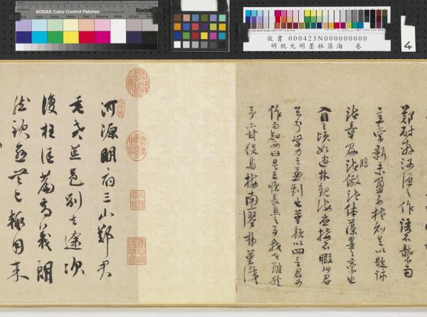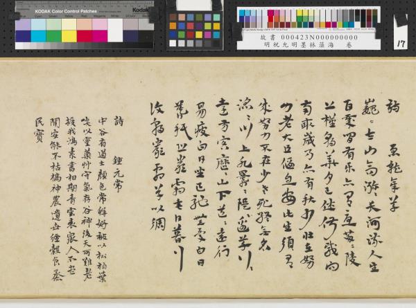 河源明府三山鄭君。垂老荒邑。別去途次。復枉佳篇。高義朗然。欽慚無已。輙用來韻綴為一章。以謝大雅。兼為一首。自述欲劣。并似正之。 流水高山本共心。朱絃疏越有餘音。才華不假江淹錦。政事重辭伯起金。躡京飛黃看俊逸。爬沙跛鼈笑浮沈。縣齋三日依然去。剩得蘭香襲素襟。 西子空對里婦心。南冠不改楚囚音。惠州飽喫蘇公飯。燕市誰收郭子金。嶺海際天秋漠漠。星河入戶夜沈沈。故山也有堪眠處。何日登臨一振襟。允明頓首。(草書)。 次韻奉答。河源鄭侯見贈之什。千古髙風一日還。摩挲塵眼對清顔。且煩元亮為彭澤。終使羊公重峴山。渤澥未容蠡瓣測。女蘿猶許兔絲攀。勞君乞與山陰譜。借取仁言此諭頑。用韵自賦一首並呈請教。 瘴嶠纔臨便憶還。空欹遊子劍前顔。窮秋歸鳥遵遥渚。矩京浮雲出故山。開被放衙星未没。推牕觀海日將攀。諸公總是藍田璧。不棄他山老石頑。寅生祝允明稿拜。(草書)。 述行言情詩。卅八。右軍。築舎負崇巘髙卑。縁秀林翠嶺絢晨。暉丹崖麗夕隂入。坐交飛英當窓語。幽禽山人適云覯。寫性將清琴郊居。賦既就白醪亦可。斟循麓看時藝桑。麻長方深未必談。名理歡暢已彌襟。 寳劍篇。大令。我有三尺匣。白石隠青鋒。一藏卅年。不敢輕開封。無人解舞術。秋山鎖神龍。時時自提看。碧水蒼夫容。家雞未須割。屠蛟或當逢。想象(點去)望張壯武。榆楊郭代公。髙歌撫匣卧。欲哭于將翁。幸得留光彩。長飛星漢中。(行草書)。 鍾山。歐陽率更。五岳峥嶸衛紫微。萬方臣妾仰光輝。鉤陳上直天皇座。少海中嚴帝子闈。峯頂日華迎鳳下。洞中雲滿待龍歸。終天王氣都留此。花木常新鳥獸肥。(楷書)。 卞將軍廟。虞永興。瘦馬城西步夕曛。祠堂翼翼護英氛。下馬入門忙拜禮。行人説是卞將軍。(楷書)。 訪隠。黃庭。君不來兮何居蹇。幽求兮山嵎。空林兮出復入。慨即鹿兮無虞。白雲兮朝飛。紛紛木葉兮皆下望。夕以歸兮旦復吾駕。君何居兮我行于野。(楷書)。 稧詩。蘭亭。秀巖蔥蔥。鳴泉涓涓。景風扇和。芳林載妍。玄運莫留。忽焉以旋。臨觀發詠。沖襟暢然。(楷書)。 蕭齋求志賦。洛神。斐然自尚者亦靈區之助歟。匪閟丘兮絶世。猶先廬兮攸附。帶邇郭兮成構。挹遥坰兮為趣。雲岑列兮緜邈。芳洲緯兮縈互。囂聲止兮層垣。幽風暢兮洞戸。碧蘿交兮施宇。紫莓團兮繡路。虛泉鳴兮漱除。浄壁晃兮揺樹。宵竹鏁兮黄月。曉松沈兮蒼霧。露旒番(點去)飜兮璇綴。霞標建兮錦傅。擷芳馨兮蓀茞。玩趯𤟭兮麏兎。肆珍圖兮髙張。陳嘉名兮特署。爾乃登丘陟墳。沈章漂句。寳蔡子兮祕笈。㣥房君兮豐庫。流璋琬兮華瑑。絢星河兮森聚。苞周紘兮廣獵。泝真源兮孤赴。則潛機兮太冲。懸皇鑑兮鴻素。抗五太兮齊襟。拊百氏兮獨歩。攬萬化兮棲臆。操三才兮在馭。於是謝將迎。遺倡和任簡傲。安晏惰。九域蟣蠓萬類洟唾。或同心兮晨集羌佳人兮宵過。蹇淹留兮夷羊。聊從吾兮妥墯攬莘渭兮齊塵。侍周孔兮末座。平伯禹兮後洚。補皇媧兮餘破。摩丹霄兮鶤運。涵玄珠兮龍卧。乃歌曰。浮青陽兮蕩素。秋日。月居諸兮與化同流。今我不樂兮乃將焉求。歌已。爰命樂童陳浩倡奏元間鳴清商。極變聲兮靡曼。陶淫思兮太康。余乃掩抑衆律。孤引圓吭。凌青旻以飛嘯兮。揜衆音而不揚。操皇雅以獨鼓兮寫神襟於混茫。忽白日兮晝冥。振衝飇兮襲堂。川鱗躍兮出潛。霄翼接兮不翔。唫九淵兮神蛟。舞千仭兮文凰。騰江河兮擊舂。盪泰華兮低昻。斯時也。獨御正陽。髙犇物先。呼吸罔象。遨嬉泰玄。與神明兮乘居。視蕭齋兮墨然。(楷書)。 詩。急就章草。巍巍大山髙。瀰瀰長河流。人生百歲間。有樂亦有憂。陵上槿。朝華夕已休。俶載向南畝。歲乃亦有秋。少壯在努力。老大且偃息。安此生須有成。努力不在少。老死終無名。 滔滔川上水。羃羃隄隄(點去)邊草。行行遠方客。歷歷山下道。道遠行易疲。白日坐已馳。無憂白日暮。祇恐嚴霜垂。日暮行復朝。嚴霜草以彫。(章草)。 詩。鍾元常。中谷有道士。顔色常鮮好。被以松柏葉。啖以靈葯草。守氣存谷神。後天可難老。授我鴻素書。相期青雲表。衆人不盡聞。安能不枯槁。神農遺世經。榖食烝民寳。(行楷)。 晉侯弗政。魯公。晉侯弗政。范文子驟見晉侯釂弗罄。亟見曰。何。范文子曰。三鄙有熢并焉。敢以鳴。晉侯問左右。烽人報乎。曰。不。君曰。不也。范文子曰。會也。以無熢人報也而鳴。若熢人報也則焉用會。晉侯曰。將厲師飭乎。問左右曰。君無令焉。君曰。未令也。范文子曰。會也。以未令也而鳴。若令也則焉用會。晉侯弗悟。范文子老。明年燕人鄭人衞人帥師伐晉。(楷書)。 濟陽登太白酒樓卻寄施湖州。眉山。昔聞董糟丘嘗為李白天津橋南造酒樓。人間二子不可見。唯有傑句挂余心。肺爛爛。珊瑚鉤。長安風沙住不得。南歸再卧蘇臺秋。泊舟濟陽城。買酒銷客愁。登樓拜先生。進爵澆黄流。知章不語先生笑。飛花亂撲過樓頭。金陵更無鳯皇遊。岳陽莫將黄鶴留。鄉關浮雲蔽落日。題詩郤寄施湖州。余為先生牛馬走。湖州乃是賀老儔。西塞山。杜若洲。與爾相期釣鼇去。千年江海同悠悠。 幽州歲殘。冠天袖海舜幽州。風候蕭森氣朔遒。雙闕日移仙仗散。六街塵滚晩衙休。馬周卧