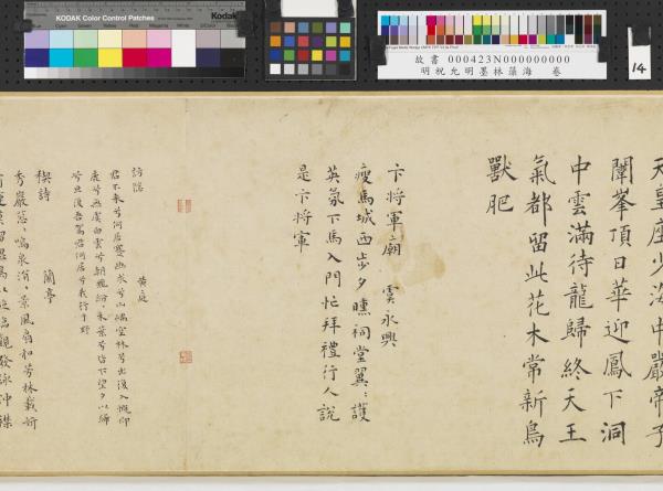 墨林藻海。(行楷書)。是卷也。枝山祝君令興寧時。酬答鄭耐□河源之作。語不襲而意常新。未盈□□。則足以題詠諸章。及臨諸(衍字)倣諸體。藻墨之豪也。入目之傾。如遊林觀海。應接不暇。何君天分學力之兼到也。堇顏以四言君可作而如要曰是五順長息之事。我在雖然。予亦甘役烏梅南廖柹堇識。 |