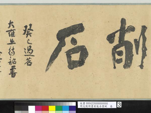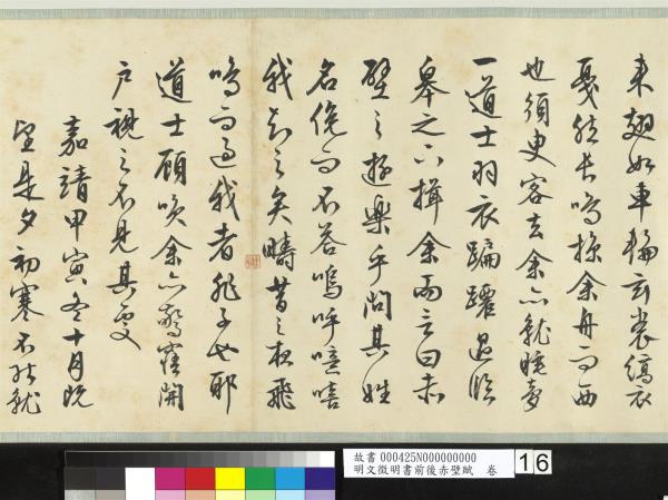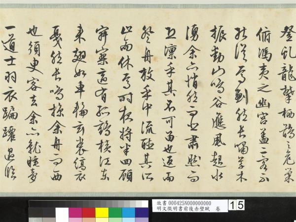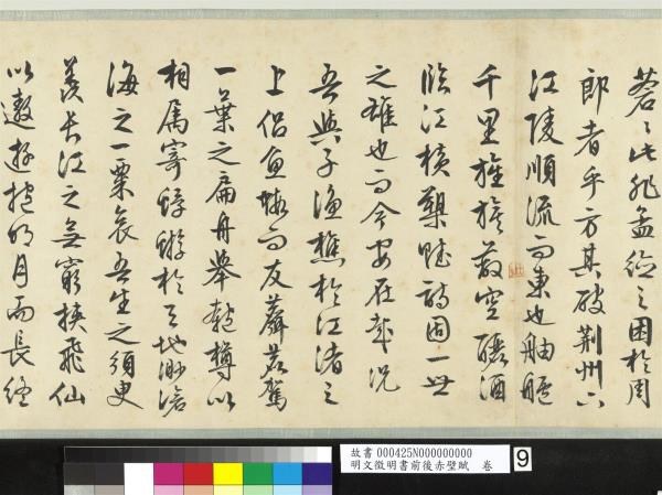 (第一則)赤壁賦。壬戌之秋。七月既望。蘇子與客汎舟遊於赤壁之下。清風徐來。水波不興。舉酒屬客。誦明月之詩。歌窈窕之章。少焉。月出於東山之上。徘徊於斗牛之間。白露橫江。水光接天。縱一葦之所如。淩萬頃之茫然。浩浩乎如馮虛御風。而不知所止。飄飄乎如遺世獨立。羽化而登仙。於是飲酒樂甚。叩舷而歌之。歌曰。桂櫂兮蘭槳。擊空明兮泝流光。渺渺兮予懷。望美人兮天一方。客有吹洞簫者。倚歌而和之。其聲嗚嗚然。如怨如慕。如泣如愬。餘音嫋嫋。不絕如縷。舞幽壑之潛蛟。泣孤舟之嫠婦。蘇子愀然。正襟危坐。而問客曰。何為其然也。客曰。月明星稀。烏鵲南飛。此非曹孟德之詩乎。西望夏口。東望武昌。山川相繆。鬱乎蒼蒼。此非孟德之困於周郎者乎。方其破荊州。下江陵。順流而東也。舳艫千里。旌旗蔽空。釃酒臨江。橫槊賦詩。固一世之雄也。而今安在哉。況吾與子漁樵於江渚之上。侶魚蝦而友麋鹿。駕一葉之扁舟。舉匏樽以相屬。寄蜉蝣於天地。渺滄海之一粟。哀吾生之須臾。羨長江之無窮。挾飛仙以遨遊。抱明月而長終。知不可乎驟得。託遺響於悲風。蘇子曰。客亦知夫水與月乎。逝者如斯而未嘗往也。盈虛者如彼。而卒莫消長也。蓋將自其變者而觀之。則天地曾不能以一瞬。自其不變者而觀之。則物與我皆無盡也。而又何羨乎。且夫天地之間。物各有主。茍非吾之所有。雖一毫而莫取。惟江上之清風。與山間之明月。耳得之為聲。目遇之而成色。取之無禁。用之不竭。是造物者之無盡藏也。而吾子之所共食。客喜而笑。洗盞更酌。肴核既盡。杯盤狼籍。相與枕藉乎舟中。不知東方之既白。(第二則)後賦。是歲十月之望。步自雪堂。將歸於臨臯。二客從余。過黃泥之阪。霜露既降。木葉盡脫。人影在地。仰見明月。顧而樂之。行歌相答。已而歎曰。有客無酒。有酒無肴。月白風清。如此良夜何。客曰。今者薄暮。舉網得魚。巨口細鱗。狀若松江之鱸。顧安所得酒乎。歸而謀諸婦。婦曰。我有斗酒藏之久矣。以待子不時之需。於是攜酒與魚復遊於赤壁之下。江流有聲。斷岸千尺。山高月小。水落石出。曾日月之幾何。而江山不可復識矣。余迺攝衣而上。履巉巗。披蒙茸。踞虎豹。登虯龍。攀栖鶻之危巢。俯馮夷之幽宮。蓋二客不能從焉。劃然長嘯。草木震動。山鳴谷應。風起水湧。余亦悄然而悲。肅然而恐。凜乎其不可留也。返而登舟。放乎中流。聽其所止而休焉。時夜將半。四顧寂寥。適有孤鶴。橫江東來。翅如車輪。玄裳縞衣。戛然長鳴。掠余舟而西也。須臾客去余亦就睡。夢一道士。羽衣蹁躚。過臨臯之下。揖余而言曰。赤壁之遊。樂乎。問其姓名。俛而不答。嗚呼噫嘻。我知之矣。疇昔之夜。飛鳴而過我者。非子也耶。道士顧笑。余亦驚寤。開戶視之。不見其處。嘉靖甲寅(西元一五五四年)冬十月既望。是夕初寒。不能就枕。因命童子篝燈書此。聊以遣興。工拙不暇計也。時年八十有五。徵明。 |