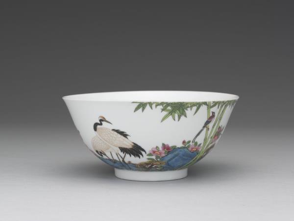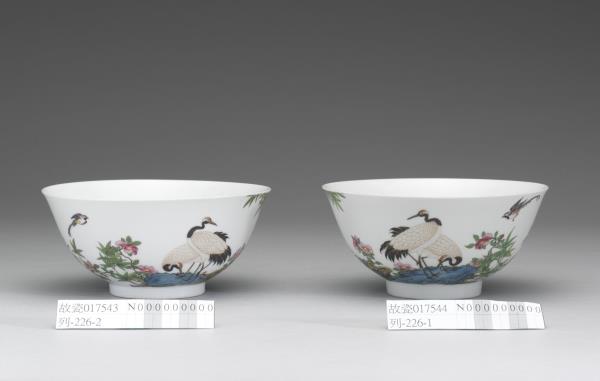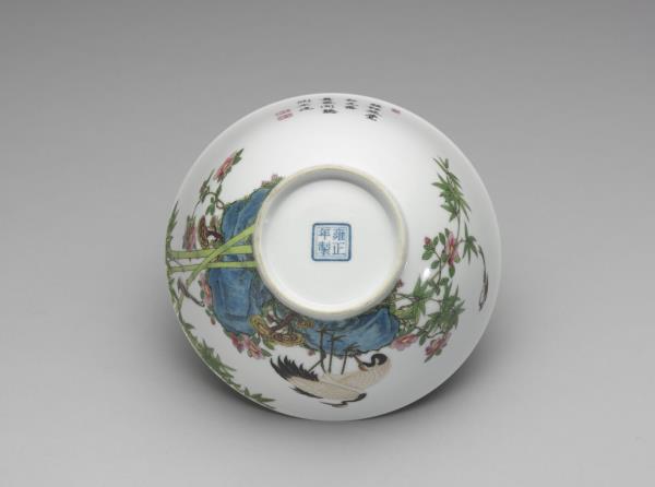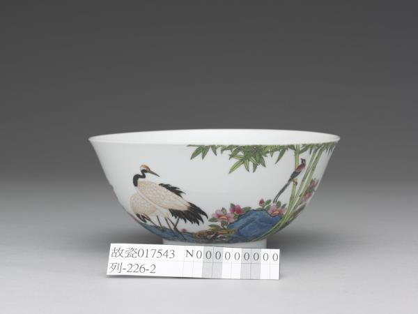 | 說明 | 碗,侈口窄唇,深弧壁,矮圈足。薄胎骨,全器內外罩施純白釉。內壁樸素無紋飾;外壁一面彩畫綠竹、灰石、靈芝及茶花,其中加飾仙鶴、壽帶各一對。一面墨彩題句:「睡輕旋覺松花落,舞罷閒聽澗水流。」首尾各以紅料描繪「鳳采」與「彬然」、「君子」三印。圈足露胎,細白堅潤,外底心書「雍正年製」雙行雙方框藍料楷書款。 |