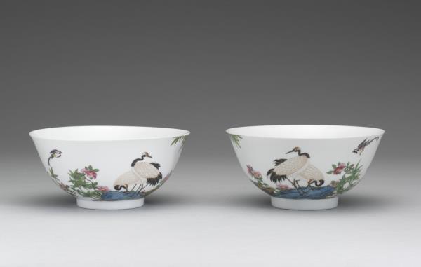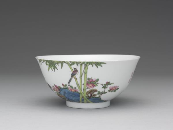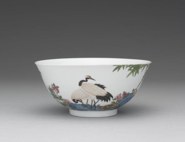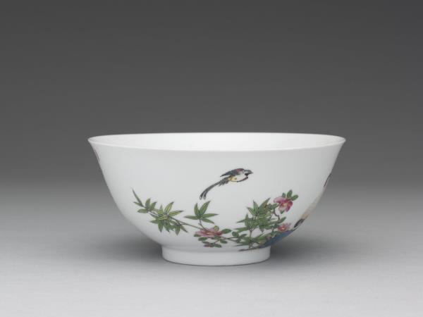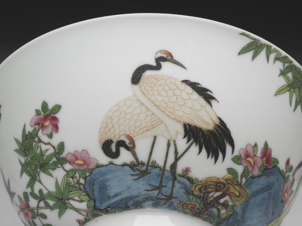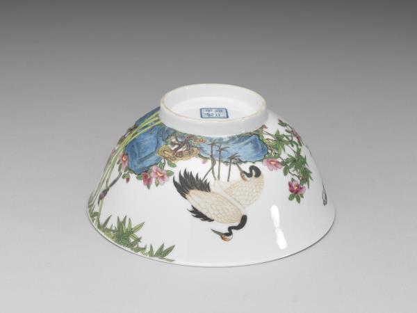 Bowl with “Lingzhi fungus and birds presenting longevity” motif in falangcai painted enamels |