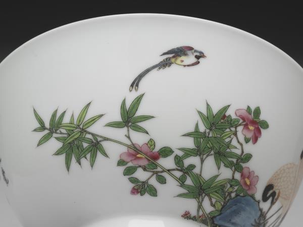 碗,侈口窄唇,深弧壁,矮圈足。薄胎骨,全器內外罩施純白釉。內壁樸素無紋飾;外壁一面彩畫綠竹、灰石、靈芝及茶花,其中加飾仙鶴、壽帶各一對。一面墨彩題句:「睡輕旋覺松花落,舞罷閒聽澗水流。」首尾各以紅料描繪「鳳采」與「彬然」、「君子」三印。圈足露胎,細白堅潤,外底心書「雍正年製」雙行雙方框藍料楷書款。