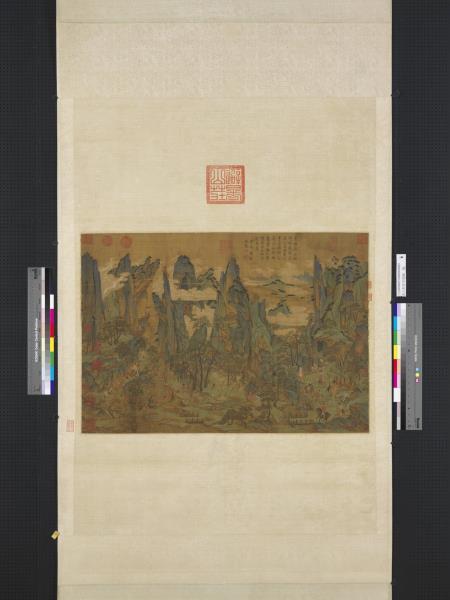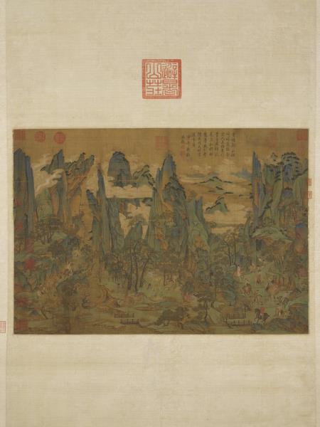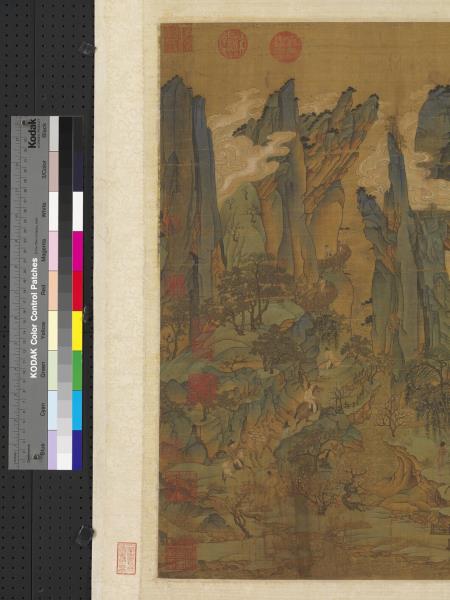 Description In the art catalogue of the Ch'ing dynasty court collection, this work was originally labeled as “Traveling through a Mountain Pass” by an anonymous Sung artist. However, based on such Sung materials as Su Shih's Colophons of Tung-p'o, scholars changed it to the present title and suggested that the subject actually represents the story of the T'ang emperor Hsuan-tsung (Ming-huang) fleeing to Szechwan from the An Lu-shan rebellion. The blue-and-green coloring of the mountains here and the precipitous forms of the peaks indeed derive from those in T'ang dynasty works. However, the refined and opulent application of washes and the precise use of lines are features that refer instead to this being a copy perhaps done in the 11th or 12th century. The mountain structure here is actually similar to the landscape in the woodblock print Illustrated Palace Tripitaka done in the late 10th century. According to texts, the style associated with Szechwan in the early Sung was mostly like this and had been mistakenly regarded as the work of the T'ang master Li Ssu-hsun. Whether this painting belongs to this manner, however, remains to be determined. Nonetheless, it represents the Northern Sung continuity of classical traditions and is quite important.(20061206)