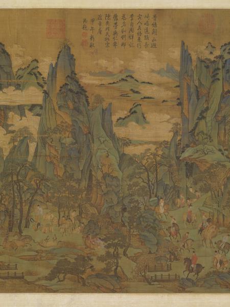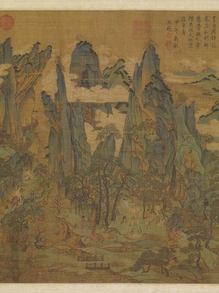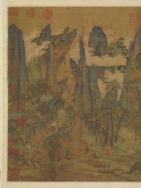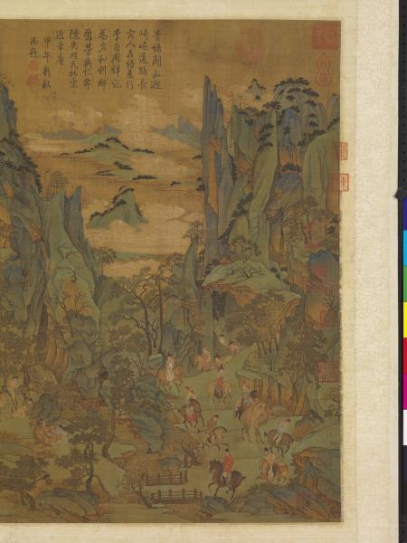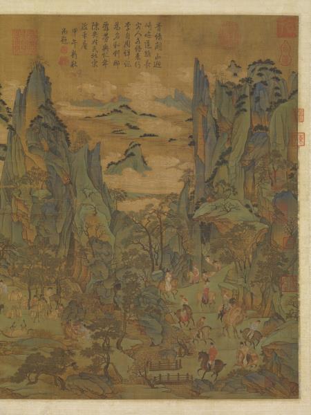Description In 755, rebel forces led by An Lu-shan succeeded in capturing the capital, Ch'ang-an. Emperor Ming-huang was forced to flee the capital, and he sought refuge in Szechuan. In this painting, the figure wearing red clothing in the lower right corner is the emperor. Astride a horse with a braided mane, he rides along a mountainous path near towering peaks dotted with trees and interlaced with clouds. The emperor's horse is proceeding through the scene. The brushwork for outlining the forms in the painting is exquisite and taut, and mineral blue and green colors give it a jeweled effect. Some scholars believe this is a faithful copy of the original by a Sung dynasty (960-1279) artist.