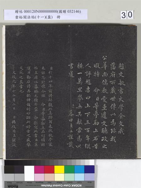 題跋 鵜殿廣生 本幅 文政元年(西元一八一八年)十二月二日。臣鵜殿廣生謹識。 楷書 臣於十四年前。得拜觀此真跡。爾來耿耿夢寐。未能忘於懷。今茲命臣等摹勒真品刻搨新帖。立原任摹謄尤精。亦蒙命影寫此書。臣輩運刀勒石。得再撫神韻刻妙跡。此好古之盛舉。文苑之至幸也。文政元年(西元一八一八年)十二月二日。臣鵜殿廣生謹識。
