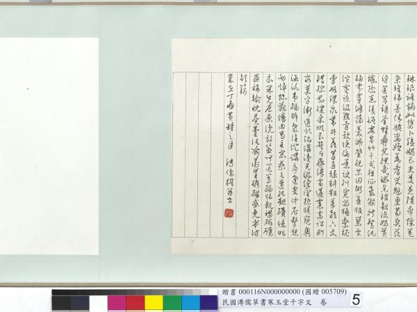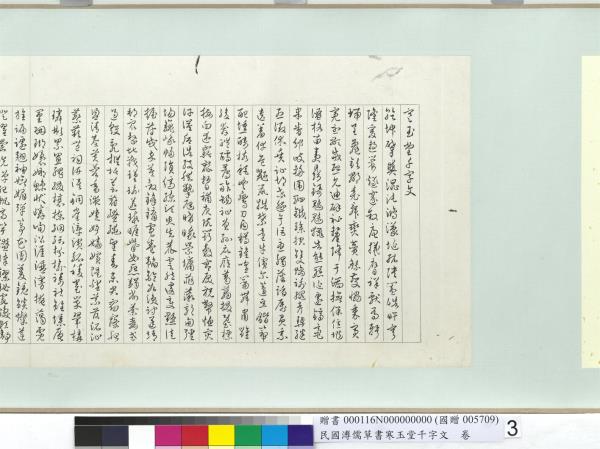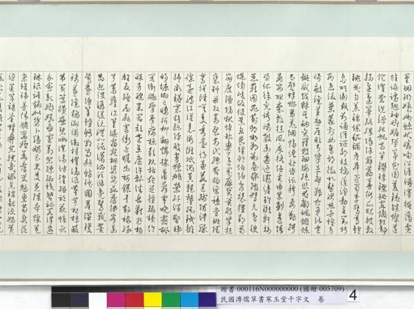 乾坤肈奠。混沌鴻濛。埏紘隤闔。晧旰穹隆。爰遡巢燧。邃敘庖犧。膺祥獻馬。輯瑞呈龜。欽鄰堯舜。爕贊繇夔。協衷寅亮。丕顯咸熙。允迪辟祚。釐降于潙。撫保億兆。謐格苗夷。鼎鑄魑魅。獵告熊羆。誕遷鎬毫。聿眷邠岐。輈圍駟鐵。驂控雙螭。踰繩考契。繼烈徵休。賁趾胡吝。遯亨詎憂。觸藩蹈厲。負乘遺羞。倖危鼫鼠。牿禁童牛。儐爾籩豆。龤箎配壎。醻核秬鬯。鸞刀卣罇。鐘喤籥舞。肅雝駿奔。醴醹薦酢。錫祉曾孫。庇廕葛藟。掇塈標梅。向述窫窳。晢補庚陔。鬭穀宥戾。祝幣恤災。訏謨后誥。股肱摯虺。睎睋崇墉。菲薇郊甸。疆場巍峩。幅隕縞練。須臾失鹿。霅然遽變。黥徒握符。戍卒箕斂。鋒鏑電卷。韜鈴冰渙。討逆靖邦。眾整堪戰。瑾瑜匿瑕。睚眥毋怨。蠲削荼毒。式遏寇亂。樅栝薈蔚。繚繞望春。未央窈窱。駘盪清塵。芙蓉香液。婕妤嬙嬪。隄塍芣苡。沼沚蘩蘋。豐祠汧涘。銅雀漳濱。觚稜崔崒。翬構璘彬。罘罳網綴。榱棟氤氳。枌榆禱社。雉堞曾闉。珊瑚嬝娜。鯨狀嶙峋。沿涯澶漫。掩藹霓旌。蹁躚翹袖。嫵媚彈箏。花團菱鏡。燄燦蓮燈。濯罍洗觶。紀甗齊竽。鐐琫鏐珌。霞煥虹舒。棲遲蓬篳。絡繹墀除。薜荔蔓衍。瓜瓞披敷。銚芅勺藥。錦爛毹鋪。彥昇篋笥。季鷹蓴鱸。魯頌衛戒。鄭誦淇謳。鄒枚摛藻。灌勃全劉。椒聊患沃。蓼莪刺幽。勇期徹札。勢決焚舟。權專懾敵。穰苴應侯。彤弓鞗革。虎䩨厹矛。湛盧鍦𢧕。越棘吳鉤。貪罹敗衂。悔絕愆尤。鄘諷蝃蝀。曹譬蜉蝣。芻蕘悃愊。濬哲咨諏。穆妻勤緝。晏嬰狐裘。教樸風厚。捨儉奚由。界劃邊陲。憑依徐兗。跨躡殽函。逶迤灞滻。玲瓏軒榭。蔥蘢囿苑。薊邱邯鄲。荊臺樊館。督亢膏腴。墝埆峻坂。侵暴忽喪。埋輪怙險。胥襲摧郢。蜀崩度隒。趨狄悼軫。輿尸違蹇。屏關冀朔。攬挹褒斜。兼攻割裂。前代強奢。柏梁竦疊。班賦騫槎。雖嗟麥秀。還憶蒹葭。逞殘防潰。驟勝遂驕。江淮袁術。隴坻隗囂。鞮鍪旄鉞。擁斾銜鑣。褰旗轢陣。破虜嫖姚。縈紆澗壑。睇眄塘坳。已悽折柳。翻憐采蕭。蕣零曉霰。楓響衝飆。攣拳癭櫟。欹臥枯匏。芝擅翰牘。伶醉芳醪。憲閻顏巷。焦廬許瓢。潘岳歎逝。揚雄反騷。扃扉寄傲。延矚喬柯。穠矣郁棣。綠兮蔦蘿。汶篁偃寢。宛栩婆娑。菰蒲拂岸。菡萏迎波。潺湲沅灃。北渚瀟湘。泛濫鳧鷖。戢翼鴛鴦。漁筌鱣鮪。敝笱赬魴。瑤圃崖澨。瓊珮蕙纕。橘洲浦漵。桂櫂滄浪。菶茸杞梓。蔽芾篔簹。攢巒碧巘。徙倚彷徨。縕袍荻幛。耿介愈彰。嫏嬛酉室。鄴架縹緗。校讎秘閣。津逮琳琅。謠煽姒孽。卜驗媯昌。夬芟莧陸。否懍苞桑。瓌瑋曼倩。婉孌姬姜。耆艾魁壘。荀爽范滂。筐筥錡釜。蜼彝兕觥。戛球參琯。韶濩媧簧。讖際舂陵。恢宏帛竹。干戈徂征。豪傑騁騖。汎掃雰雺。滌蕩羹沸。罃脫纍囚。弼逢版築。賈誼謇諫。汲黯骨骾。便佞導諛。糾寬尚猛。繫柅牽姤。渫泉幕井。羨昔返璞。耕耘莘潁。六爻錯綜。剛健柔順。艮巽占蠱。洊雷遘震。需訟剝窮。萃孚漸進。坎陷溝瀆。兌滋澤潤。探賾窺奧。涵泳韋編。析裁詮證。講序逵虔。仲尼擊磬。劬瘁彌艱。燔肉曷至。宋蔡屯邅。純懿纘緒。昭示開先。屈原讒放。筮叩筳篿。緬循軌躅。砥礪勖旃。輸忱葵藿。託喻蘅荃。磷緇或免。希訪彭籛。歲在丁酉(西元一九五七年)。黃鍾之月。溥儒撰並書。 |