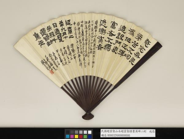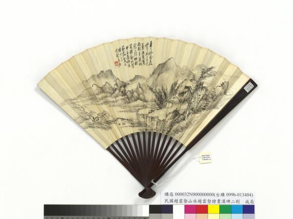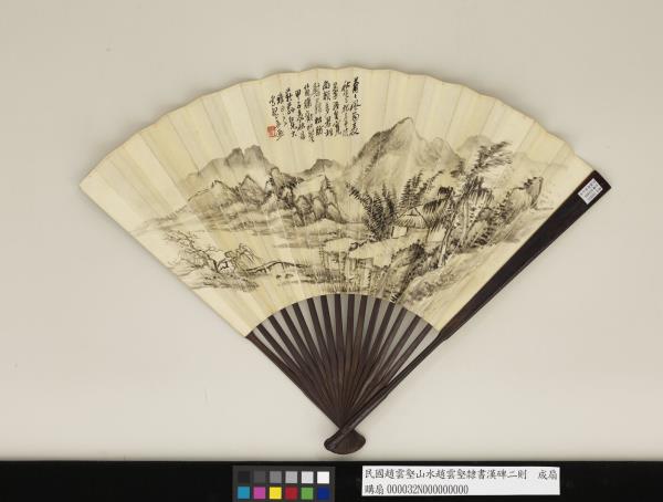 | 參考書目 | 許文美,〈民國趙雲壑山水並隸書漢碑二則 成扇 山水〉,收入《惠風和暢 ─ 摺扇集萃特集》(臺北:國立故宮博物院,2016.06),頁124-127。 |