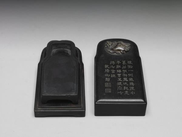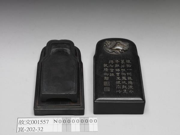 | 說明 | 端石,石色紫赭,硯琢鳳池式,墨池首兩旁,各削0.3公分,面呈鳳字形,硯背窪入,有兩足,墨池上方壁鐫「鳳池」二字篆書,背中央鐫清高宗御題詩乙首,楷書,「懷鉛一例提攜便,小篆分明勁鳳池,疑是早朝歸賈至,徒容吟得七言詩。」款題:「乾隆御題」,有鈐印二:「比德」、「朗潤」。 |