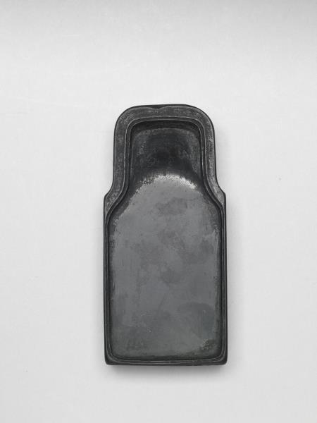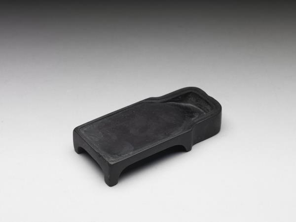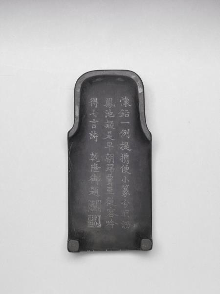 端石,石色紫赭,硯琢鳳池式,墨池首兩旁,各削0.3公分,面呈鳳字形,硯背窪入,有兩足,墨池上方壁鐫「鳳池」二字篆書,背中央鐫清高宗御題詩乙首,楷書,「懷鉛一例提攜便,小篆分明勁鳳池,疑是早朝歸賈至,徒容吟得七言詩。」款題:「乾隆御題」,有鈐印二:「比德」、「朗潤」。