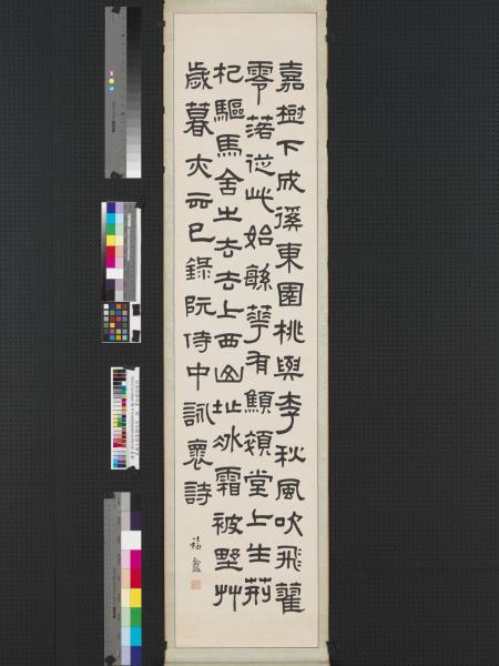 嘉樹下成徯。東園桃與李。秋風吹飛藋。零落從此始。繁華有顦顇。堂上生荊杞。驅馬舍之去。去上西山址。冰霜被野草。歲暮夾云已。錄阮侍中詠懷詩。(隸書)。福盦。(行書)。 |