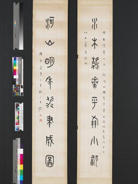 水木清華呼朋小飲。河山明秀涉筆成圖。(篆書)。水木清華呼朋小飲。河山明秀涉筆成圖。此吳愙齋中丞以大篆集聯也。戊子(西元一九四八年)嘉平之月。福厂王禔。(楷書)。 |