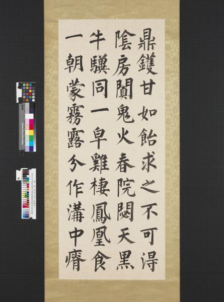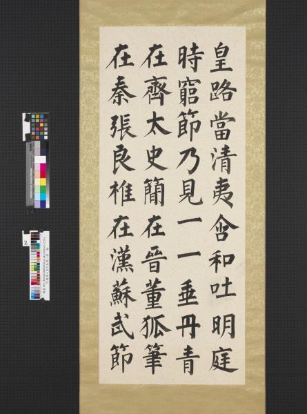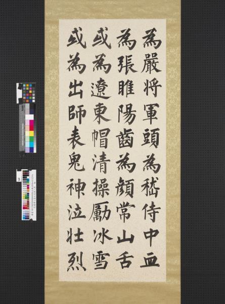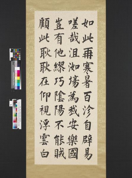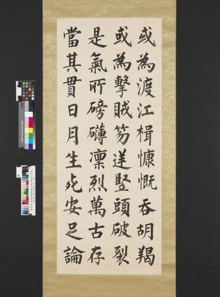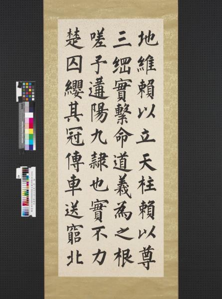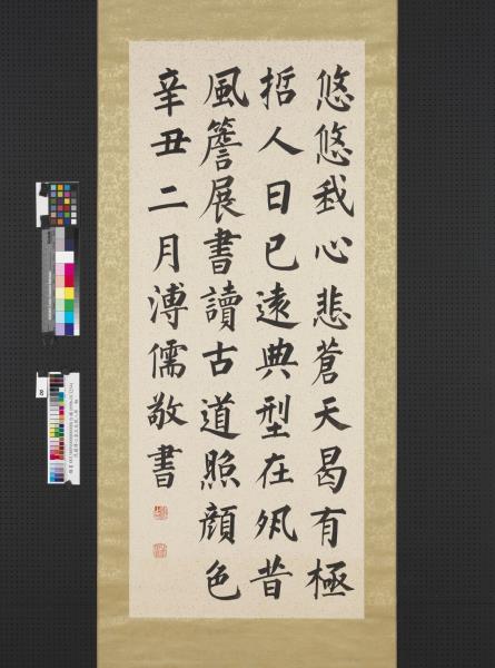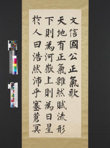 文信國公正氣歌。天地有正氣。雜然賦流形。下則為河嶽。上則為日星。於人曰浩然。沛乎塞蒼冥。(第一屏)皇路當清夷。含和吐明庭。時窮節乃見。一一垂丹青。在齊太史簡。在晉董狐筆。在秦張良椎。在漢蘇武節。(第二屏)為嚴將軍頭。為嵇侍中血。為張睢陽齒。為顏常山舌。或為遼東帽。清操勵冰雪。或為出師表。鬼神泣壯烈。(第三屏)或為渡江楫。慷慨吞胡羯。或為擊賊笏。逆豎頭破裂。是氣所磅礡。凜烈萬古存。當其貫日月。生死安足論。(第四屏)地維賴以立。天柱賴以尊。三綱實繫命。道義為之根。嗟予遘陽九。隸也實不力。楚囚纓其冠。傳車送窮北。(第五屏)鼎鑊甘如飴。求之不可得。陰房闐鬼火。春院閟天黑。牛驥同一皁。雞棲鳳凰食。一朝蒙霧露。分作溝中瘠。(第六屏)如此再寒暑。百沴自辟易。嗟哉沮洳場。為我安樂國。豈有他繆巧。陰陽不能賊。顧此耿耿在。仰視浮雲白。(第七屏)悠悠我心悲。蒼天曷有極。哲人日已遠。典型在夙昔。風簷展書讀。古道照顏色。辛丑(西元一九六一年)二月溥儒敬書。(第八屏)