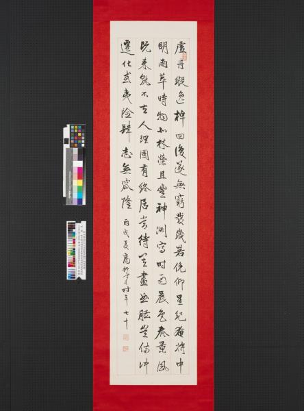 | 釋文 | 虛舟縱逸棹。回復遂無窮。發歲若俛仰。星紀奄將中。明雨萃時物。北林榮且豐。神淵寫時雨。晨色奏景風。既來孰不去。人理固有終。居嘗待其盡。曲肱豈傷神。遷化戎夷險。肆志無窊隆。丙戌(西元一九四六年)夏高振霄。時年七十。 |