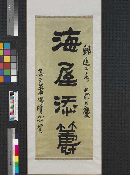 海屋添籌。(隸書)。輔廷二哥六旬大慶。愚弟蕭俊賢敬賀。(行書)。