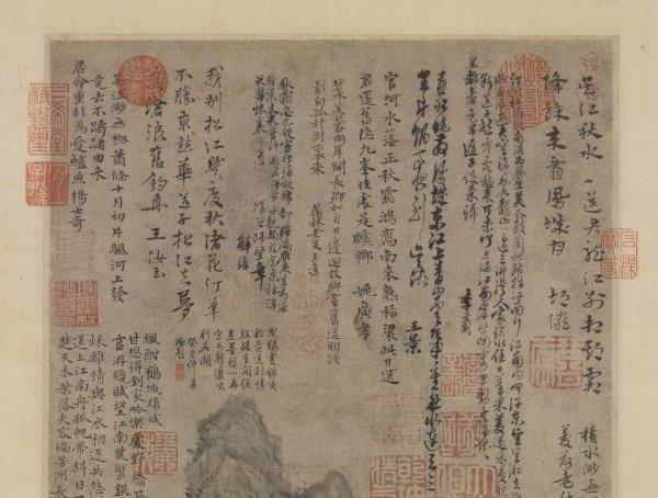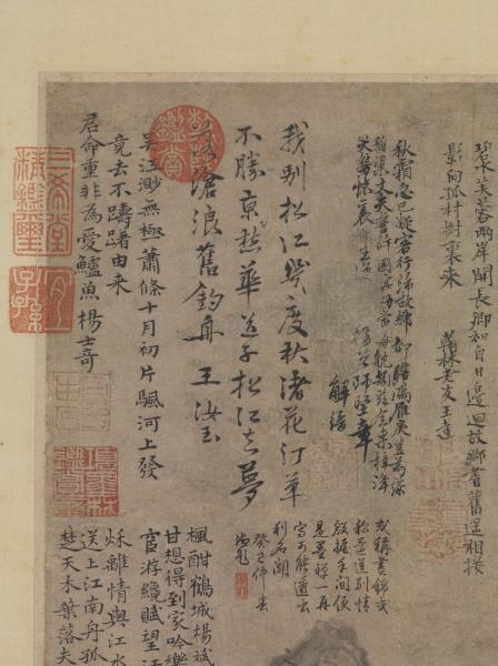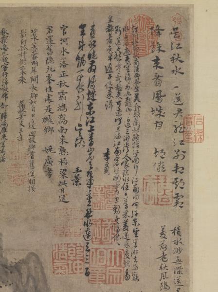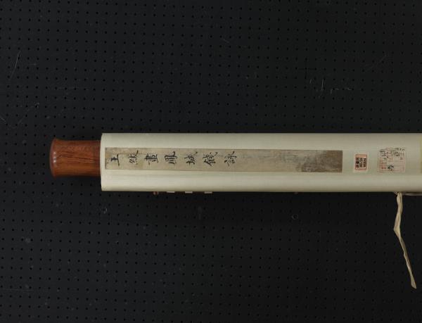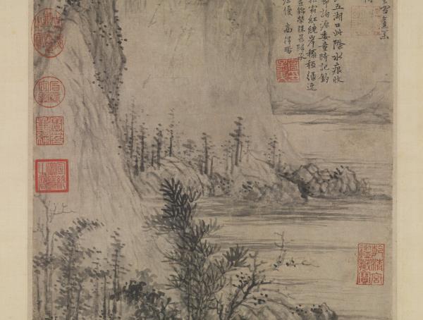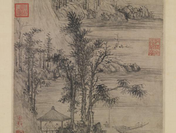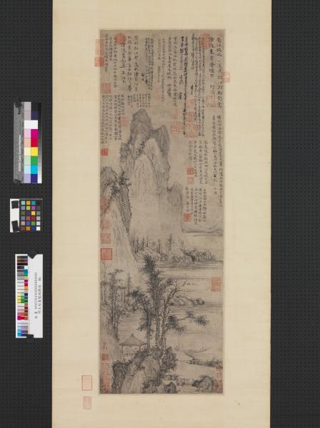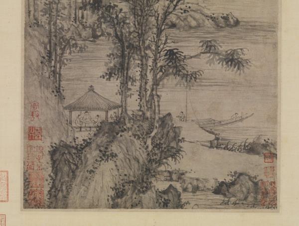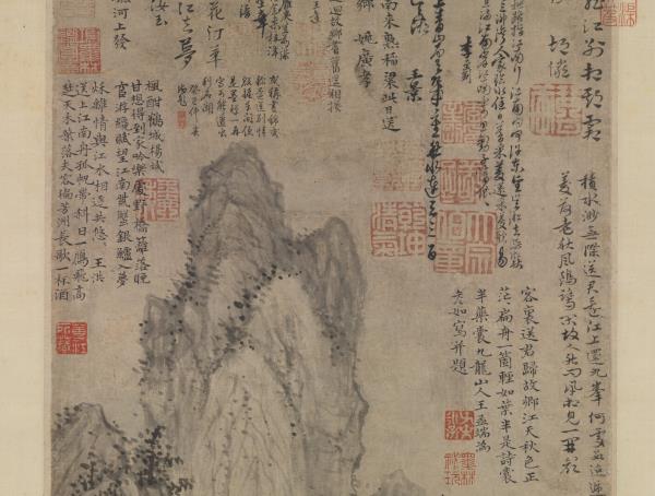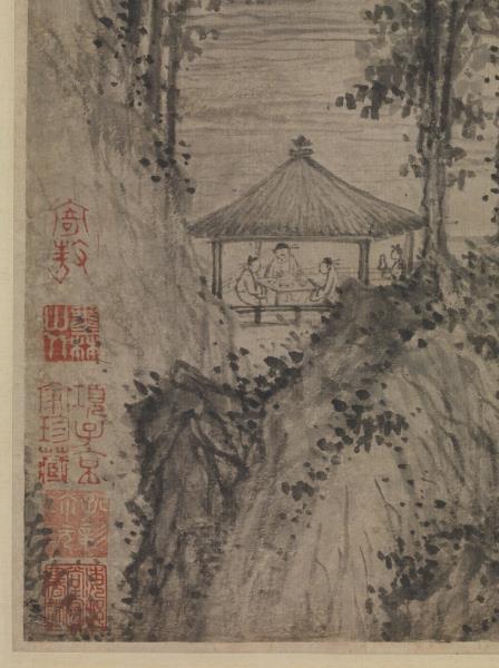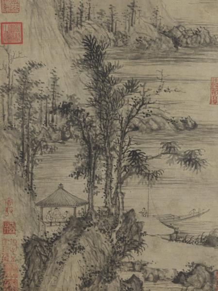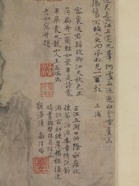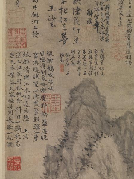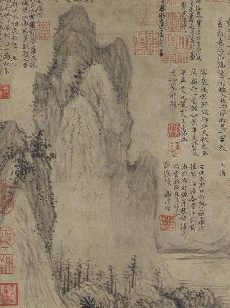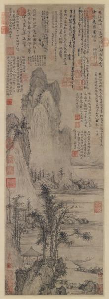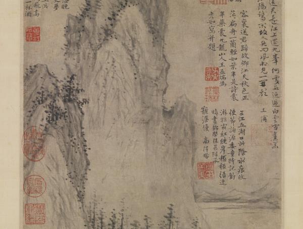 王紱,江蘇無錫人,早年曾接受從仕的教育,由於具有文學才能,又擅長書法與繪畫,在明成祖永樂朝文淵閣任職,仕至中書舍人。他喜好代表文人品味的墨竹與寫意山水畫,兼具職業畫家的技巧與士人畫的特質。平日作畫隨性而為,但是他品性高潔,不隨意為人作畫。這幅畫的構圖單純,近景平坡水岸,樹石間三位官員聚在亭子裡宴飲,背景則是兩重高聳的山峰。畫面上端的空白處,題了十三首詩,內容都是圍繞在表達離別的情意,作詩者大都是與王紱同在翰林院任職的官員。從詩意看,可知是在秋天時節,一位同僚即將離職,回到松江的家鄉,享受有山水為伴的退隱生活,王紱作了這幅半具象的山水畫,同事們則各題一詩做紀念,是明代盛行的送別圖的典型例子。受畫的對象或參與題詩者,都是有文藝修養的文士,王紱的畫也能表現出元代以來,以簡單的水墨畫法,表達有畫外深意的文人畫作風。山石平穩堆疊,岩石表面扭動交錯的皴擦紋理,令人感受到平靜中又帶著些許蒼涼與感傷。(何傳馨)