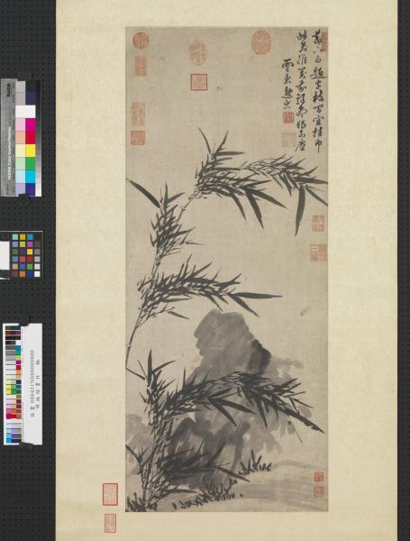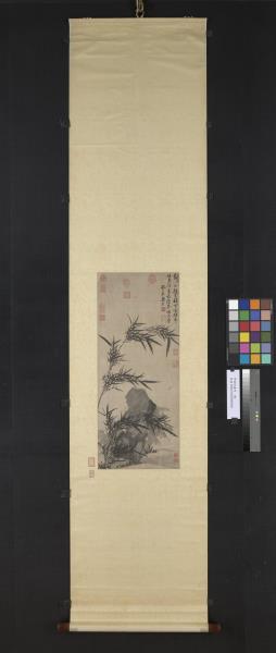 此幅寫意畫叢竹幽石。竹以墨筆挺健寫成,具書法之用筆;石則水墨淋漓,渾然一體。兩相比照,饒富意趣。