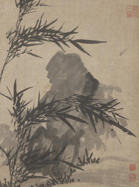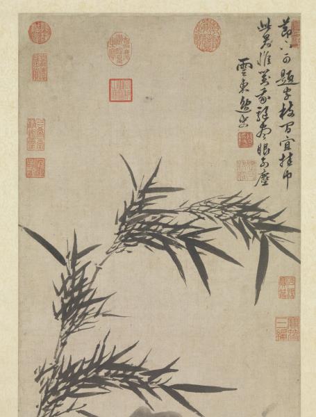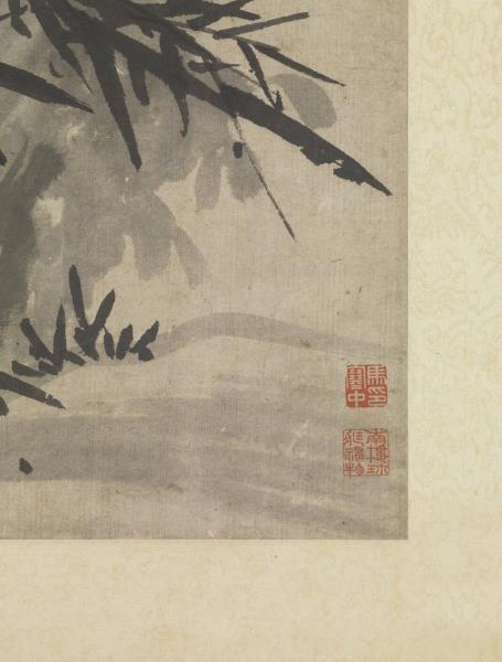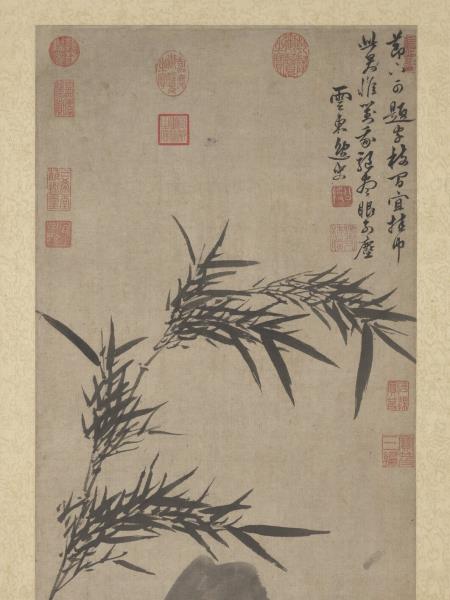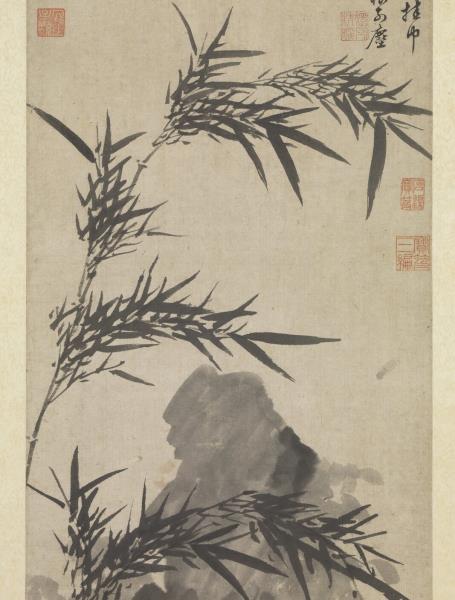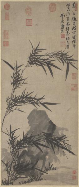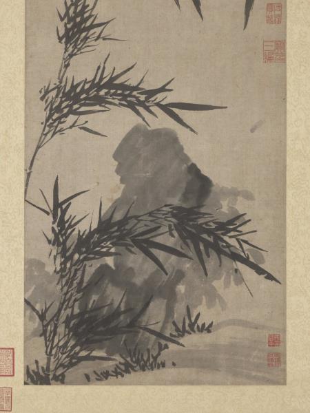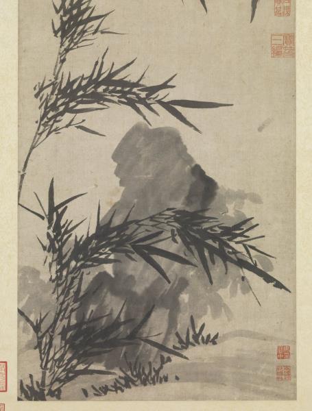 A few stalks of bamboo and a solitary rock complete this freely sketched work. The straight, supple bamboo are drawn in ink in calligraphic brushstrokes; the solid mass of rock is limned in fluid ink. The two complement one another well.