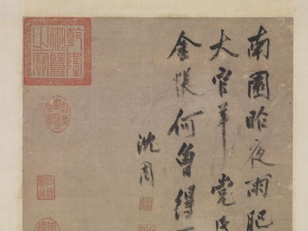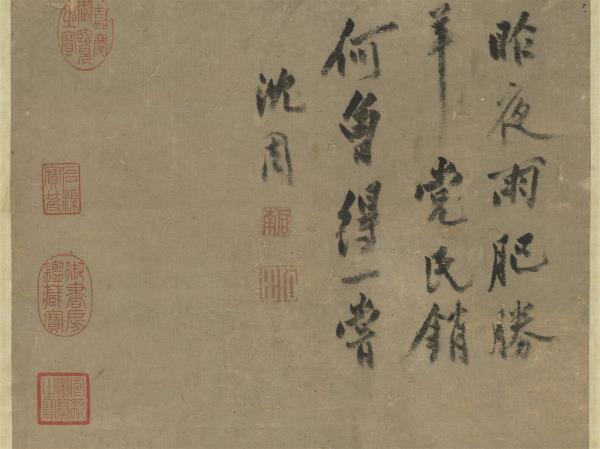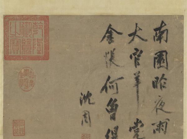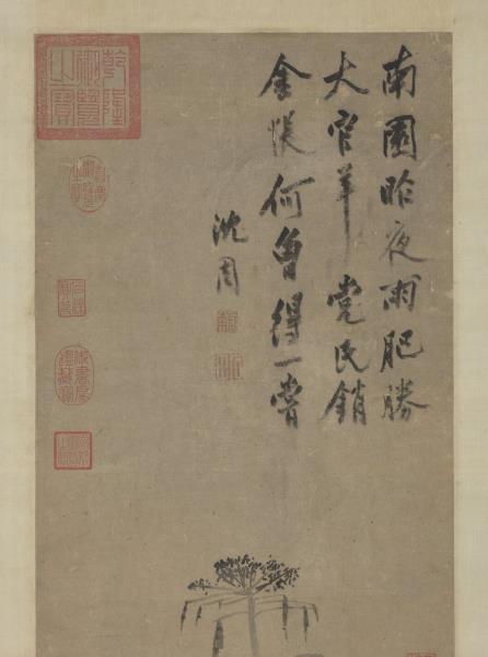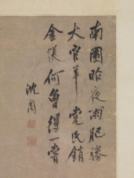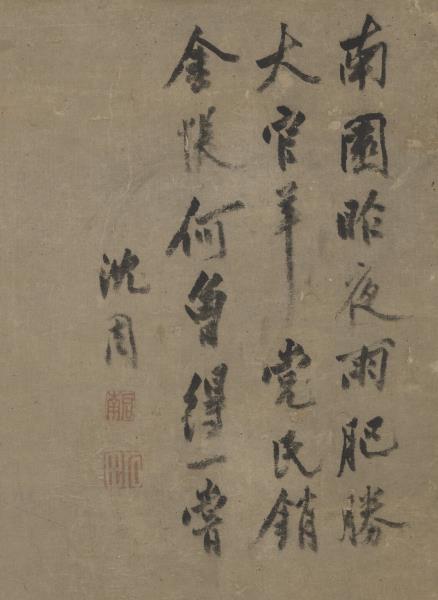 沈周(1427—1509)為蘇州吳派領袖,兼擅詩文書畫。幅上款題:「南國昨夜雨,肥勝大官羊。党氏銷金帳,何曾得一嘗。」書體學自黃庭堅,筆法沈著穩健,體勢挺拔,詩內容引用「党家風流」一事,言宋人陶穀(903—970)有妾,原本為太尉党進之家姬。一日遇雪,穀取雪水烹團茶,顧妾曰:党家有此景否。其妾云:彼粗人安識此景,但能於銷金帳下,淺斟低唱,飲羔羊美酒耳。穀,默然大慚。【注1】沈詩寓意淡泊自甘,不惑於奢華富貴。