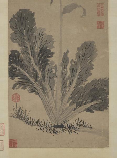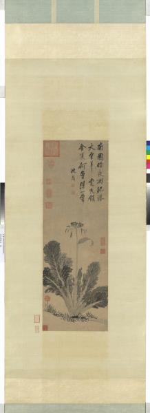 沈周(西元一四二七至一五○九年),字啟南,號石田,又稱白石翁,江蘇長洲人。為人寬厚有大度。能詩文,工書法,又善畫。山水、花卉、禽獸、人物,樣樣俱能。後人將周氏與文徵明、唐寅、仇英尊為「明四大家」。 芥菜一株,筆法鈍勁,用墨厚潤。畫未署年款,約為沈氏六十六、七歲間之作。
