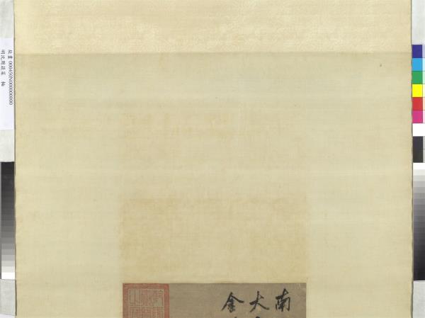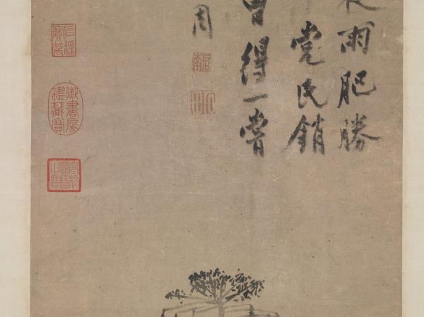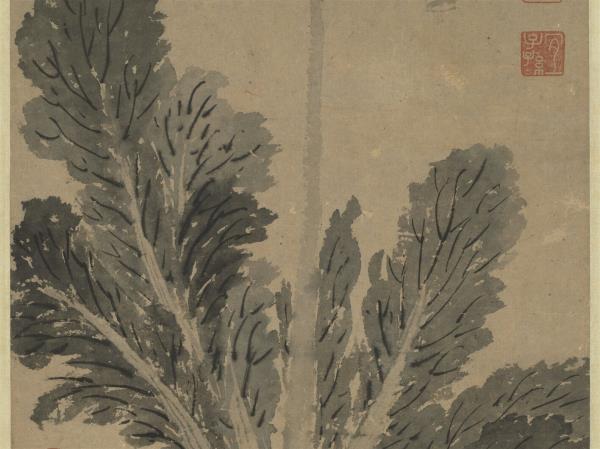 This painting takes the form of an “intimate scenery” composition with a single bokchoy plant shown in a garden setting. The stalk of the vegetable was rendered with light outlines and washes; the flower, leaves, and veins were done with complementary washes of light and dark ink. A brush with dry ink was used to texture the slope, highlighted with moss dots and grass in light and dark ink. The entire work is succinct and unadorned, the tones of ink integrated into a coherent whole. The brushwork is practiced and mature, lying between restrained and unrestrained, at the fountainhead of the “splashed ink” and “sketching ideas” methods. The artist’s inscription at the top takes up a large portion of the composition and complements the painting. The calligraphic style, deriving from that of Huang Tingjian (1045-1105), is steady and upright, making this a fine work combining Shen Zhou’s arts of poetry, calligraphy, and painting.(20110102)