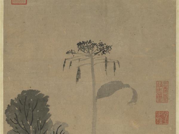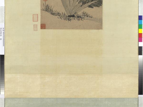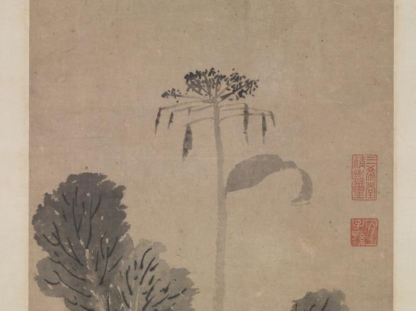 沈周在蔬果中,加強詩情畫意並寄情寓性,其神化移情之筆,可謂盡得象外之意,遂成沈周詩畫合一的典型佳作。此畫取材雖簡樸平易,卻符合作者「藏至真於淡薄,安貧賤於久長」【注2】的文人旨趣,經由題跋的陳述,意義顯得更為深遠。沈周的水墨寫意蔬果,院藏另有《寫生冊》,皆用意甚精而筆墨不拘小謹。沈氏此類體裁風貌,可能脫胎於南宋牧谿法常一派,【注3】並傳承元人張中(14 世紀人)墨筆花鳥手筆,【注4】但已改變了宋、元人那種工整寫實暈染的畫法,又能自出新意,筆墨已在欲放未放之間,開啟了文人作品以蔬果入畫的風潮。此意念後經陳淳(1483—1544)的發揚光大,開啟了徐渭(1521—1593)的潑墨寫意,再經清代八大山人(1626—1705以後)、揚州八怪等的承續發揚,至今不衰。(陳階晉)