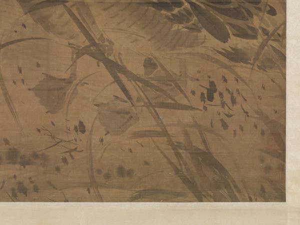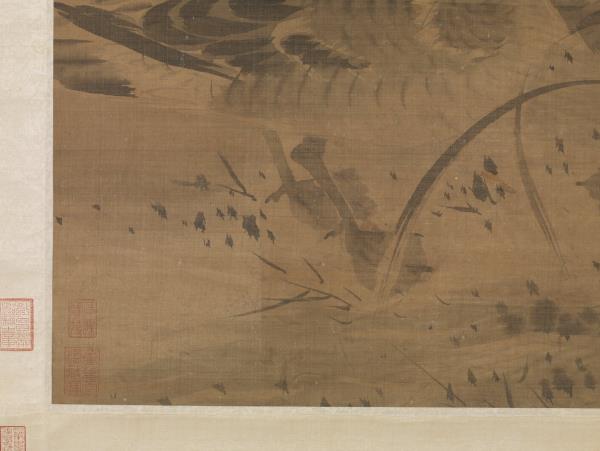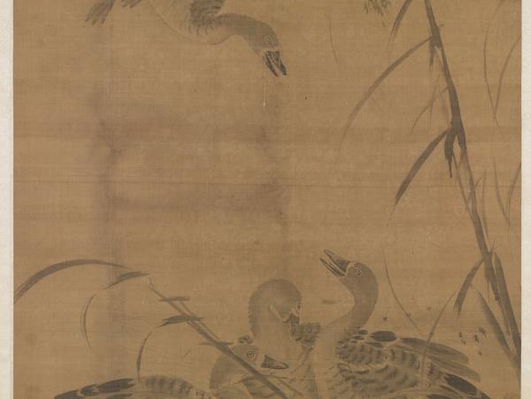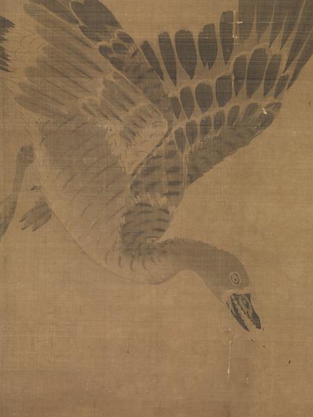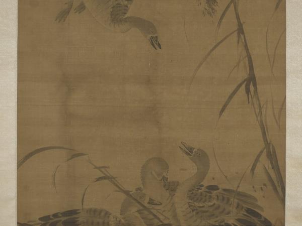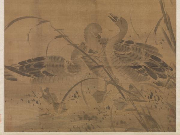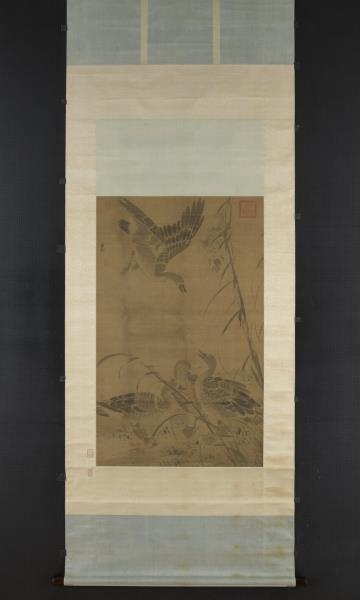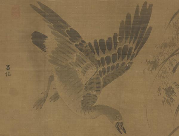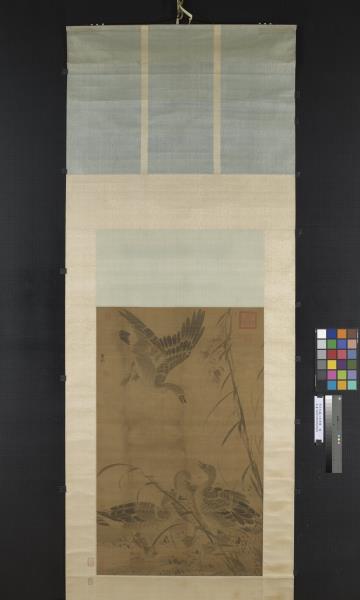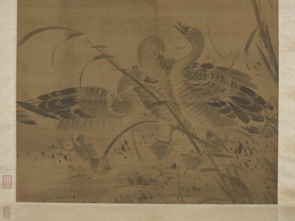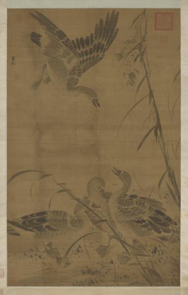 呂紀(活動於1439-1505年間),浙江鄞縣人。字廷振,號樂愚,一作樂漁。花鳥初學邊文進,後摹唐宋諸名家筆,始臻其妙。弘治(1488-1505)間被徵值仁智殿,為錦衣衛指揮使。 秋雁兩雙,飛鳴棲息於葦塘沼泥之中。通幅為墨畫,水墨具足,行筆草草而意態若生。其款雖為呂紀,幅左下卻有「字以善」一印,以善為林良之字號,本幅畫風亦近之。