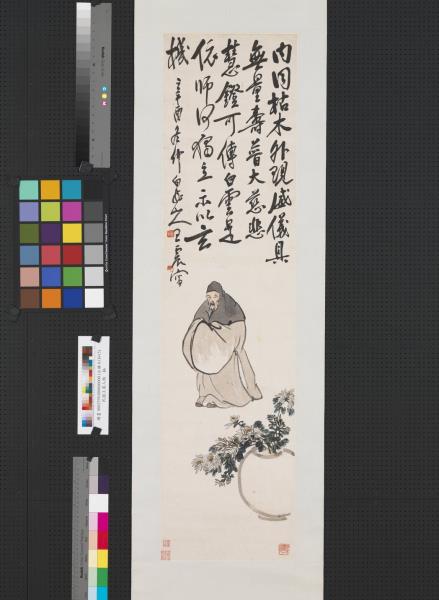 | 作者款識 | 王震 印記 | 本幅 | 內同枯木。外現威儀。具無量壽。普大慈悲。慧鐙可傳。白雲是依。師何獨立。示以玄機。辛酉(西元一九二一年)冬仲白龍山人王震寫。 | 草書 | |||||||||